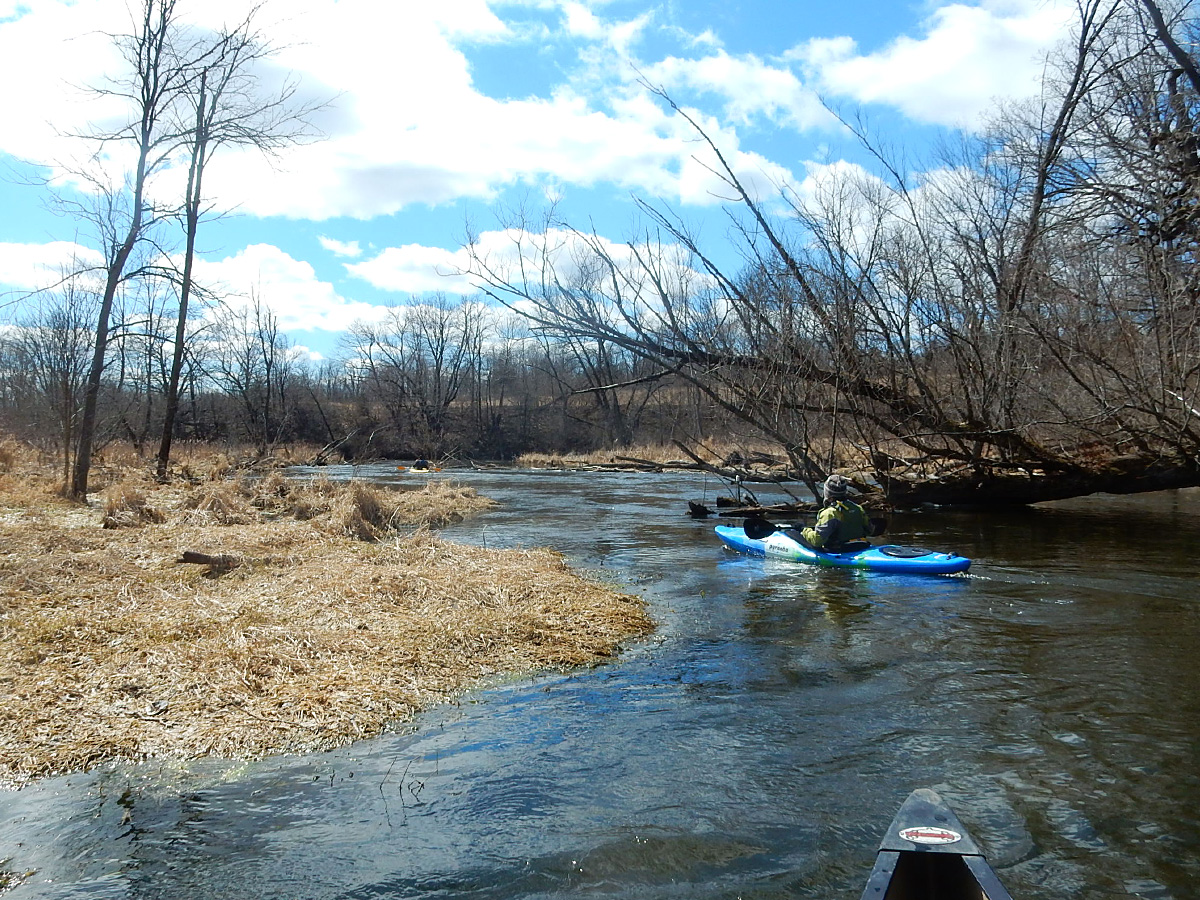 While I’ve paddled some portion of segments below the Rome dam more times than I’ve got fingers to count, this was the first trip where I got to see the river/pond upstream of the dam. It’ll take only a couple minutes after launching at County Road E to slip away from the world and be enveloped in a kingdom of marsh and woods for a few miles. The water here is deep and dark – totally the opposite of what you’ll encounter on the other side of the dam, where it’s clear and shallow. The pond environment is enjoyable, even for a flatwater escapade. We might have felt less endeared to it, had we had to share it with motorboaters; but all to ourselves on a sunny, early-spring day, it was lovely (minus the wind).
