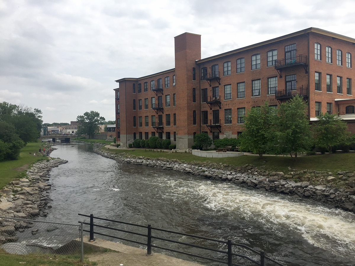The river then doglegs into downtown in a narrow corridored-like fashion with riffly current pushing and pulling you downstream. Soon after the watertower, the banks grow to a steep rock wall on both sides, and you’ll see the West Mill Street bridge in front of the Kraft Factory. This is the best drop of the trip. Take the right chute to ride the gentle but splashy wave (prepare to get wet). That Kraft mill rapid is intimidating not for the surf but because the current is fast, leading you to the trees beyond. Currently, (no pun intended) there are two crappy trees to negotiate (the ones Joe is trying to get removed and where the Harley dude wiped out). At these levels, they were easy enough to get by without portaging in a kayak, but a canoe would probably be more difficult due to your own height in the boat. The first tree will take some work to remove but the second tree/branch is small and a sawzall should take care of things (gift idea for any of my family reading this!) In the meantime, navigate both on river-left and portage river-left if you can’t make it under the second (and though smaller, the more awkward of the two to negotiate).