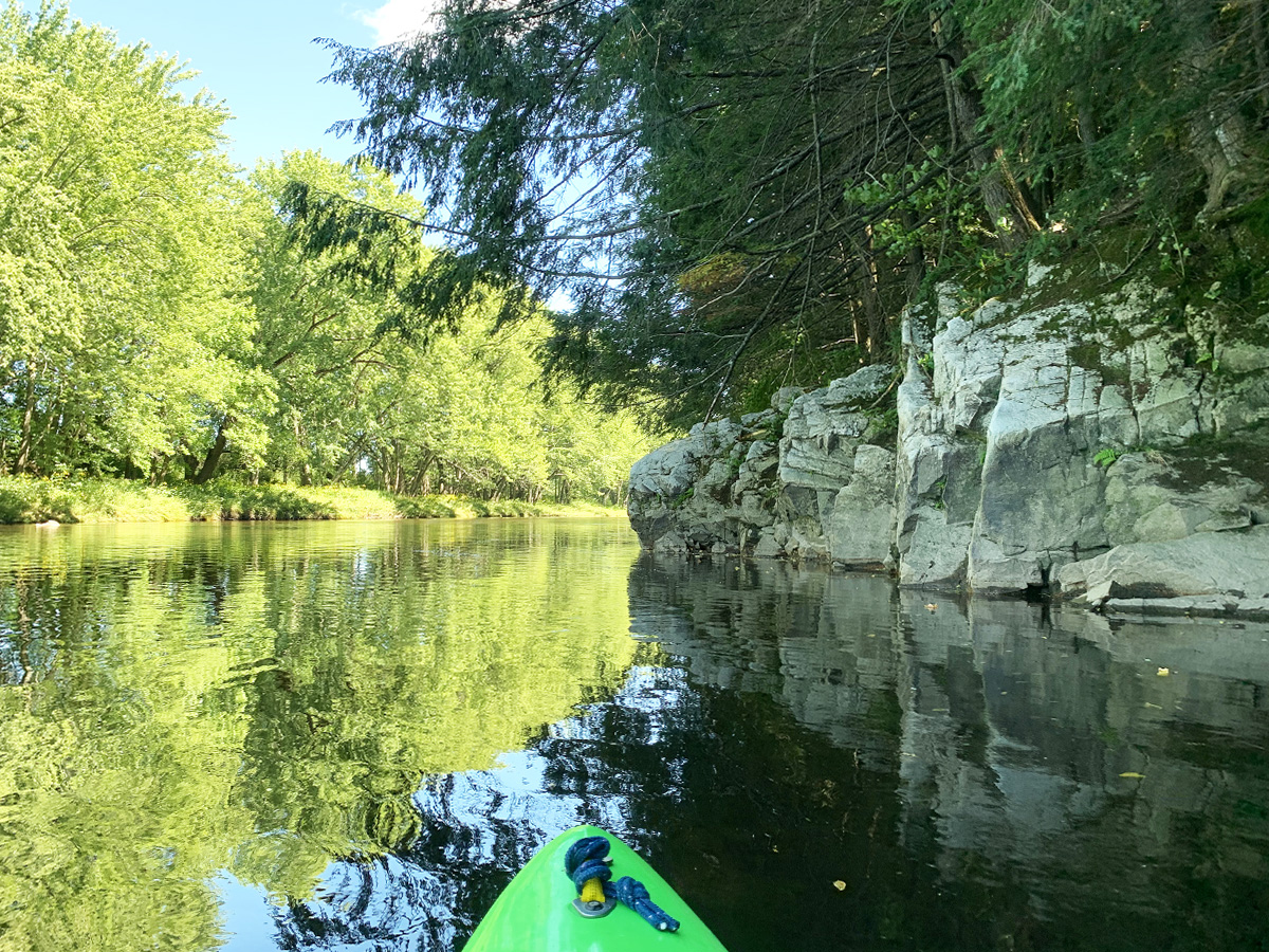 This trip has three makeups. The first third meanders over light riffly stretches that alternates from canopy-covered to woodsy banks. Here you’ll encounter a few small islands and some rock outcrops, too. The second part is mostly straightaways which are long, broad, and gentle with less riffles but you’ll find even more appealing outcrops. The final section is more like the beginning when it gets back to a twistier, more interesting “what will come next?” sort of feel, with many more sweeping curves. It gets wider and a little slower in places but it’s quite interesting for a first time Big Rib River-er.