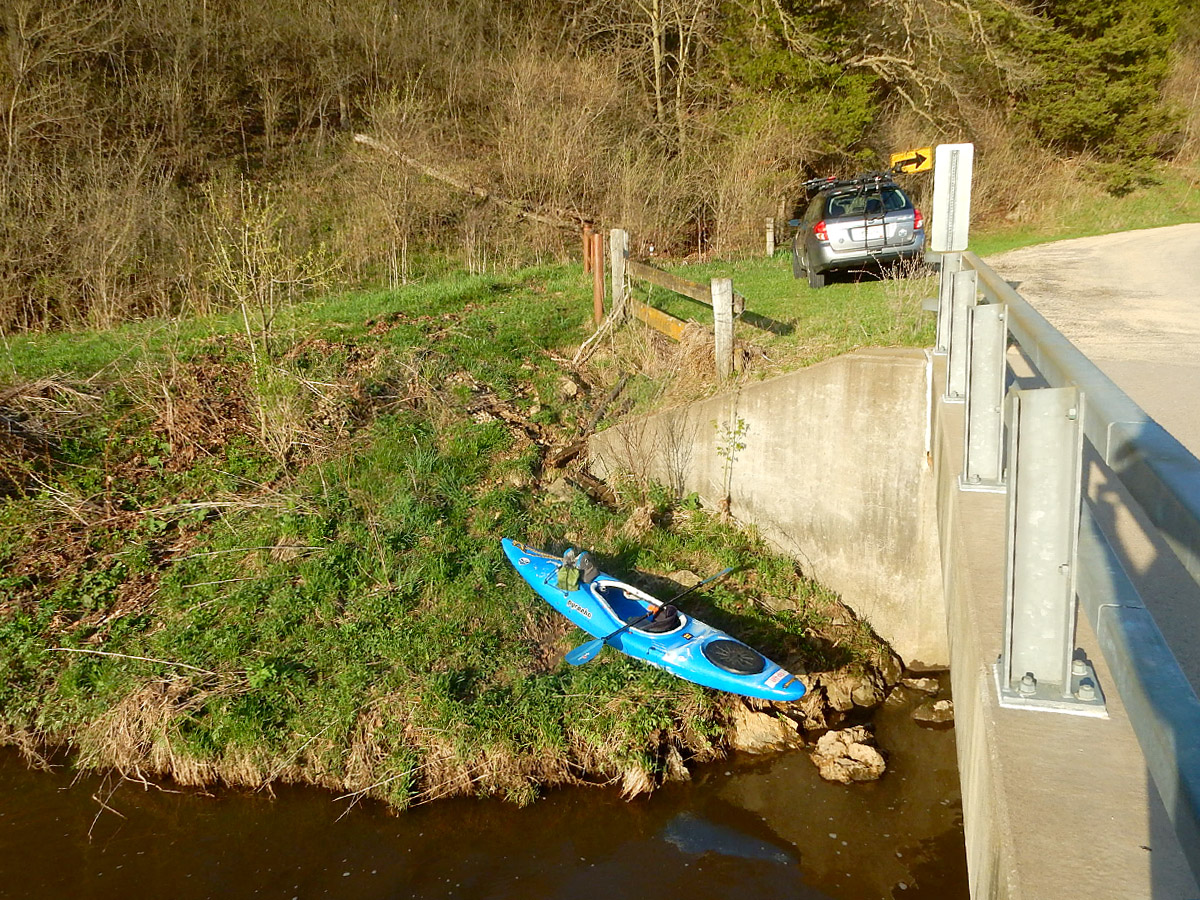 Nonetheless, our interest in El Rio Azul was rekindled after that guide the DNR created. It was just a matter of time to line up the right circumstances. Come May 2018, a couple days before my birthday but just after a good, hard rain, all signs suddenly pointed to a rare window of opportunity to check out the knockout of the beguiling Blue, mistress of mysteries. But the Bowers-to-Shemak segment is only 6.3 miles long, which seems a smidge short for the drive. So we scouted bridges up- and downstream to determine how to make a longer trip. The next bridge downstream from Shemak is Biba, but this adds only a mile-and-change, the river here is dominated by monotonous agriculture, and the bridge access is crap. Below Biba is a longer stretch to County Road G, but it too is distracted by farms, plus it’s densely wooded, which lends itself to deadfall hell.