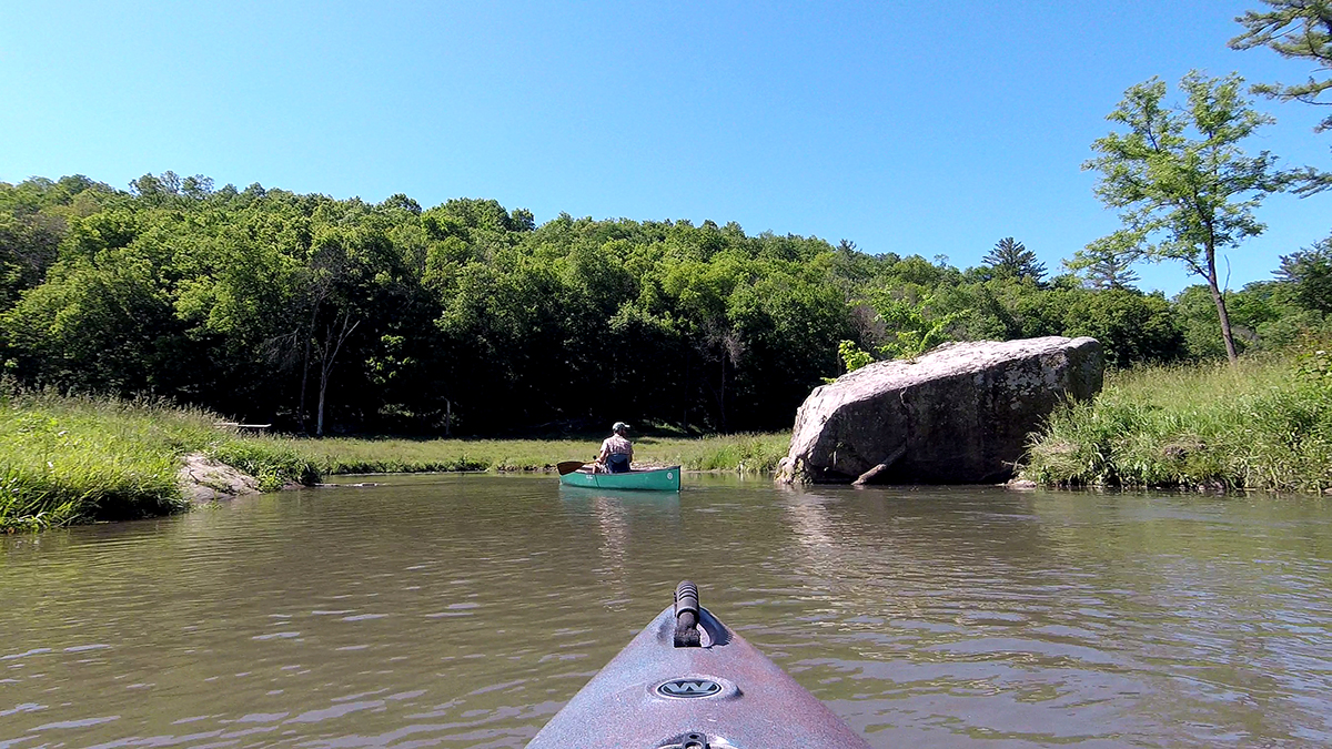 The previous trip report beautifully describes the essence of the Blue River and the surrounding landscape. To pick up on where Tim left off, the Blue River is a trout stream and you can feel that while you are paddling it. The work that the DNR and/or other groups have done to preserve the river for fish/wildlife and water quality is commendable and impressive. I was surprised by the extent that the river shores are lined with rock in so many different areas to ensure the viability of this Class 2 trout stream. Especially at the beginning of the trip, it felt like we were paddling in a park because of the rock shores and the freshly planted grasses still filling in. The extent of the DNR ‘landscaping’ of the river definitely keeps the water moving at a good clip and keeps the riffles vibrant. Add on top of it the boulder gardens and the surrounding hillside of the Driftless region and the whole trip is truly unique and distinct from other paddling trips in the area.