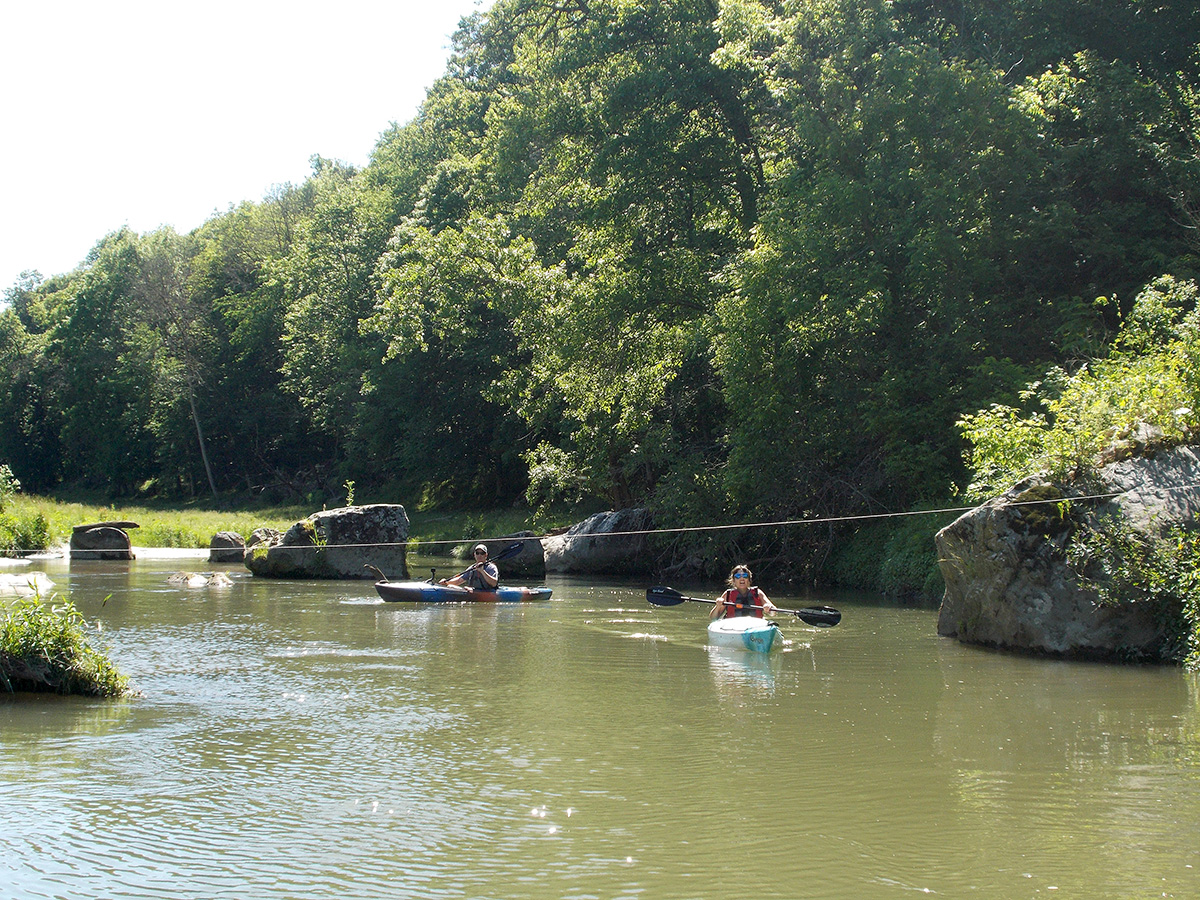 From Bluff Road to the next bridge at Snowbottom Road is a 2.4-mile section that is astonishingly aesthetic. First, there are the bluffs and hills. Immediately to the west of Bluff Road is a gorgeous rock outcrop that stands above the landscape like a gargoyle. Then there’s the swift current, riffly and just fun. Already you’ll be passing too many springs to count. Also already is the first of two wooden cattle gate obstructions. Like a former bodybuilder, gravity has not been kind to this structure; it’s dilapidated and sags in the middle, which is fortuitous for paddlers, as it allows for pretty easy riding over it – after getting a full-steam-ahead charge leading up to it. Think of it as the country equivalent of a tennis court net in an abandoned inner city park. It’s a minor hassle, and experiencing the surrounding landscape and up-close boulders is more than worth the brief nuisance.