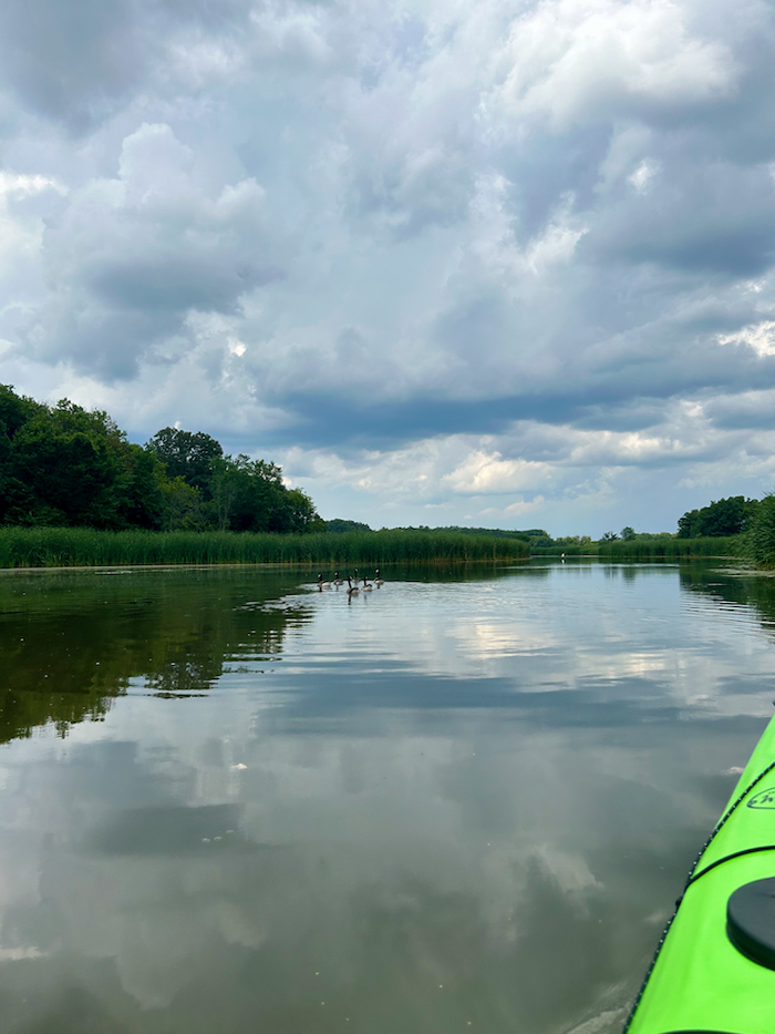 I launched from the north ramp and paddled through the estuary toward the North Pool, leaving traffic at the ramp quickly behind, I was soon alone. At the end of this estuary, I turned right/east past the small island and proceeded across the lake to the estuary and viaduct leading under Higgins Road. I continued north on this channel as far as I could go. This is a very quiet section of the lake with thick reeds along both sides of the channel. I encountered no other paddlers, but did see several herons and egrets. I trailed a flock of Canadian geese up the channel until they broke off, then two families of ducks. I found a large snapping turtle shell, approximately two feet long floating in the reeds. The large pool at the very end of this channel was full of ducks and geese but too shallow (only 1 foot before my paddle hit bottom) to make it worth entering. I retraced my route and exited back through the Higgins Road viaduct, then veered left/east to explore the eastern-most pool.