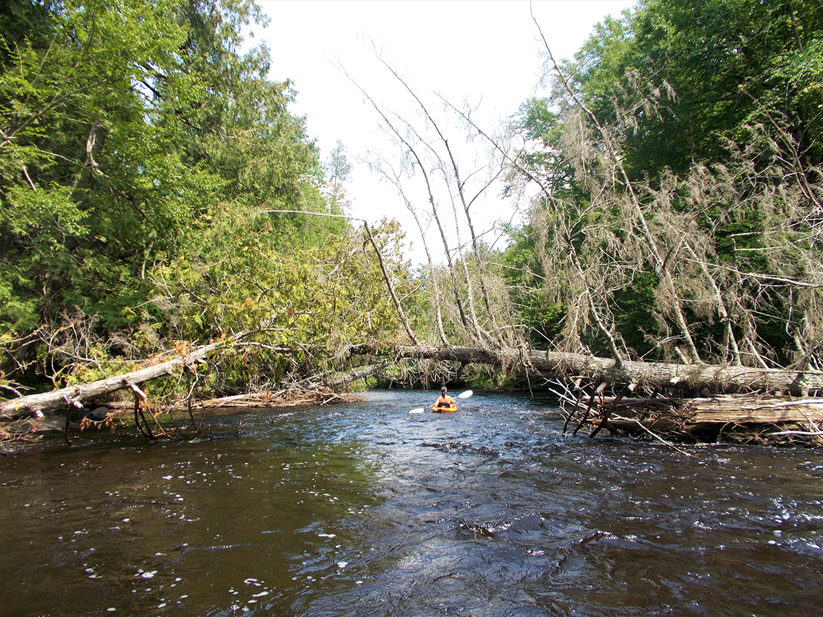 Highway 55 to Highway 139 has numerous sections of class I-II rapids (some of them are quite long and sustained) between quiet stretches, riffles and the occasional beaver dam to portage amongst the forested surroundings. Dam Rapids is a “tricky” Class II that needs to be scouted on account that it often contains strainers. This sections finishes with the fun Class IIs of Stevens Creek Rapids near the takeout.