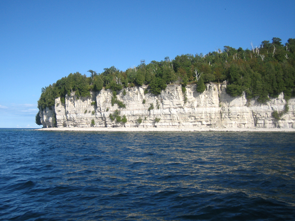 When the conditions are right, (you want the water to be flat and calm) paddling around the circumference of the island is an amazing experience. The shoreline changes dramatically from the western side to the eastern of the island. The eastern shore is much more rugged and tall where there are numerous limestone outcrops, sea caves and even a sea stack. The southern shore tapers and the tree-lined shore becomes more level with rocky shoals that soon give way to sandy beaches, then to rock and sand, and finally to cobblestone which seemingly goes on forever along the western shore past the boathouse. Most of your launch points from the campsites are located in the southwest rocky and cobblestone terrain. The trip around the island is a total of six miles and takes about two hours.