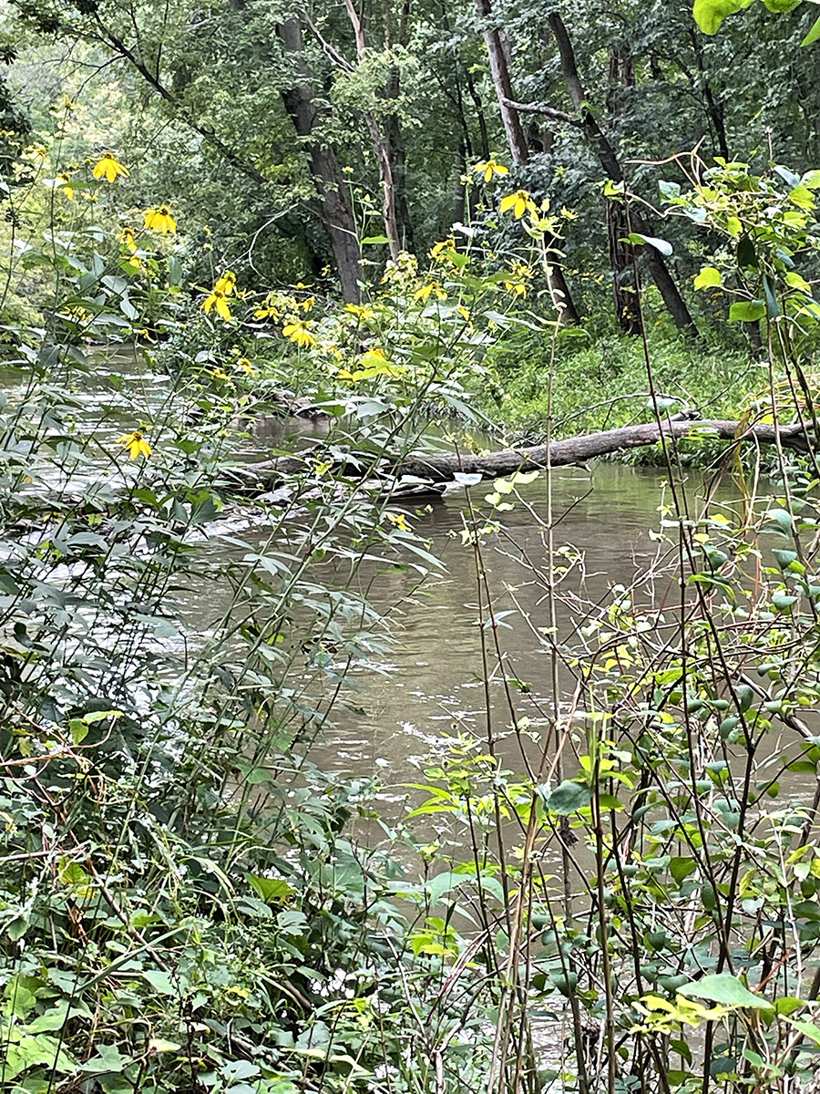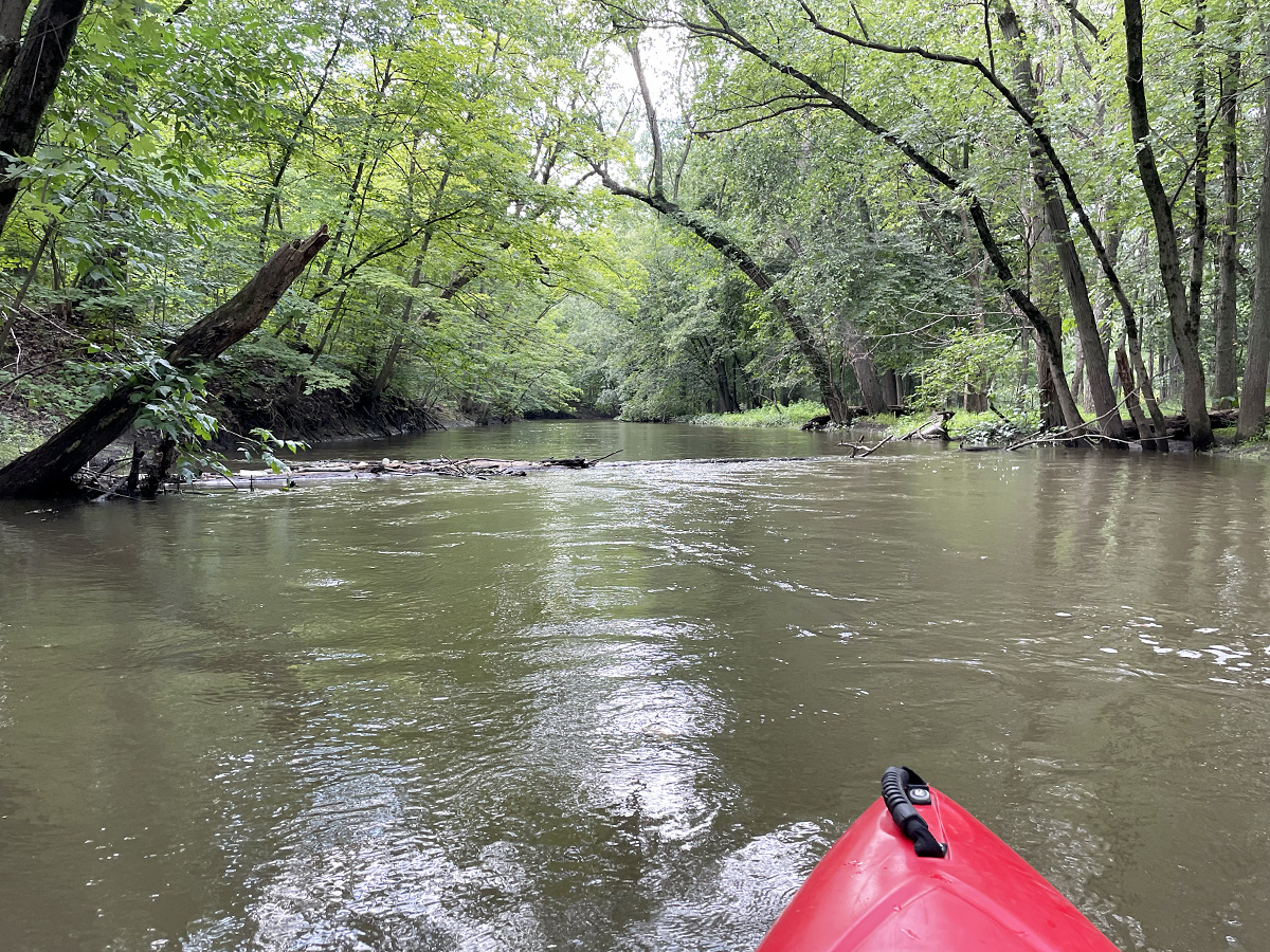 On my August paddle, there was a large logjam about a third of a mile upriver from the Bunker Hill bridge takeout. It was an easy portage on flat, relatively solid and poison ivy-free ground. Steer to river left, and take out before the bridge. There is a short incline to the paved path, then another 180 feet up a hill to the parking lot.