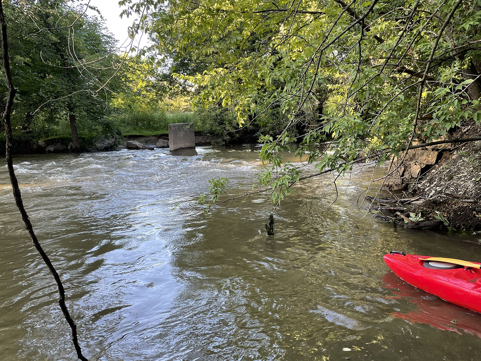 Several of the dams along this route have been removed, not only improving the paddling, but also the ecosystem for fish and invertebrates. There are still two small check dams remaining between Blue Star woods and Bunker Hill that have to be portaged at lower water levels: at the Chick Evans Golf Course (under the bridge at Beckwith Road), and at the Tam O’Shanter golf course in Niles. The dams do not present a serious recirculation danger. At high water near 300 cfs the Evans dam is washed out. At medium to high water, the Tam Dam can be floated over, and it produces some nice waves that can be surfed. Design work is being completed for removing those two dams in the near future. Because of the dams, paddlers may want to plan trips from Skokie Dam to Linne to skip the latter dam, or start at Linne to avoid the first dam. Starting at Bunker Hill avoids both dams, and is about 7 miles. Put in at the small pedestrian bridge called “Bunker Hill Bridge” just south of the parking lot at Bunker Hill Grove #1.