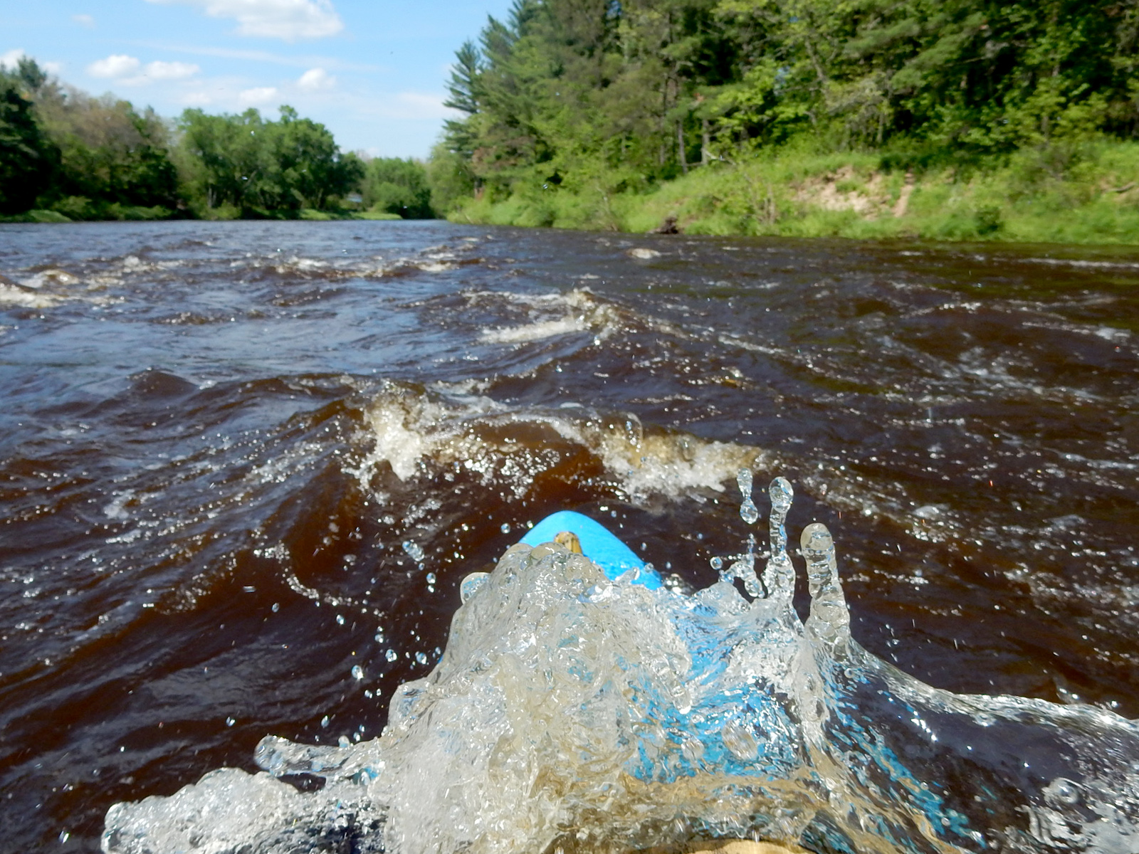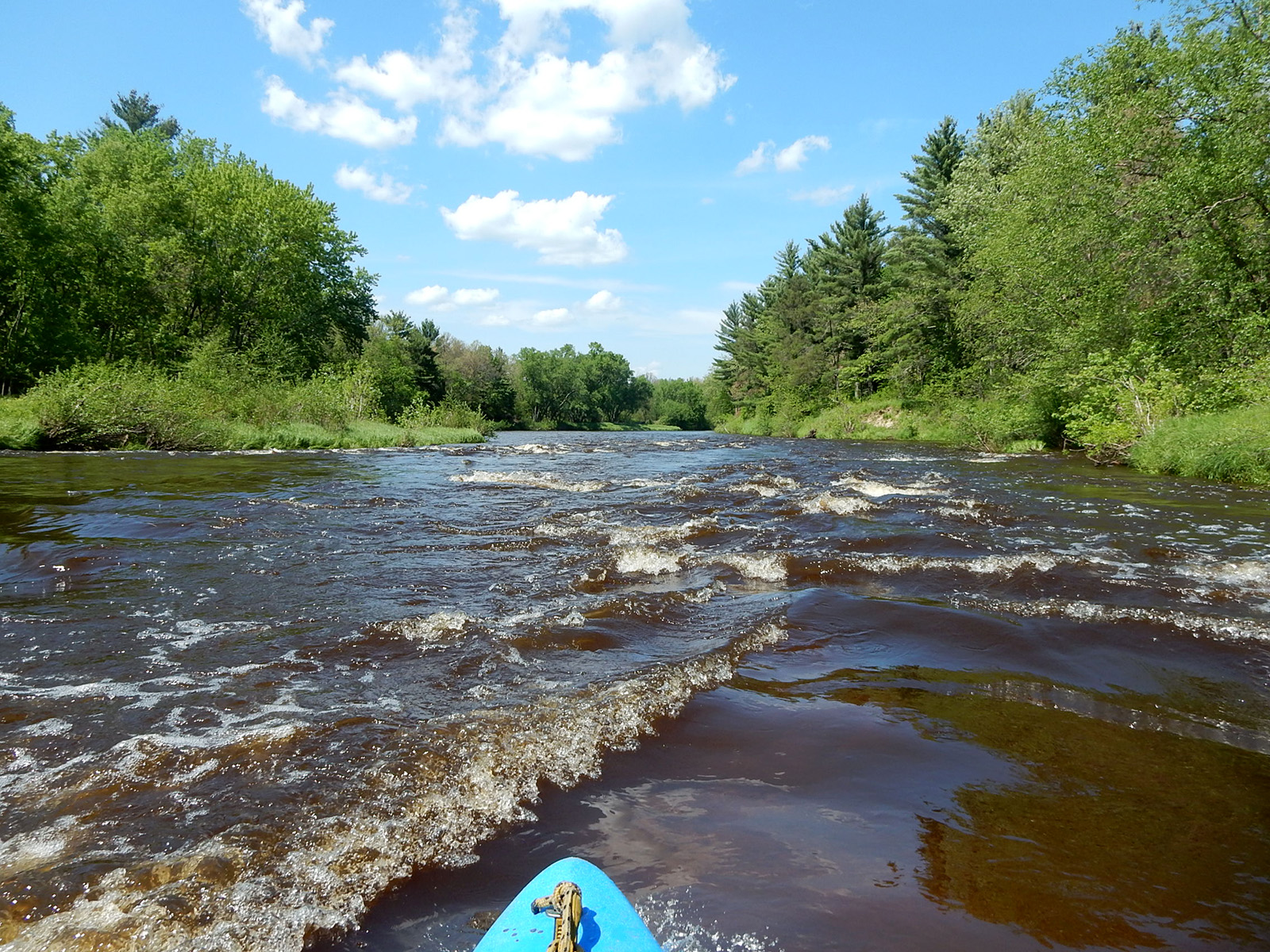 Once you enter the Eau Claire River you can relax and indulge in a leisurely float since it’s so broad and wide (unless you’re paddling it at a low level, in which case you’d have to pay attention to navigating around the shallows). You can hear and see a set of Class I+ rapids about a hundred yards upstream of the confluence. Not to worry; there are at least three additional sets of rapids below the confluence, so you’re not missing too much. This stretch of the Eau Claire is known for featuring the most continuous rapids, and you’ll appreciate why. Nothing ranks as high as even a Class II, but some do require a bit of sensibility to avoid capsizing. Several of them are long “fields” of rapids – meaning, little waves and chutes far as the eye can take in – in front of you, to the left and right. They’re a lot of fun. After each one you can kick your feet back up and again and relax. It becomes a pattern you’ll soon appreciate: relax, rapids, relax, rapids, repeat.
