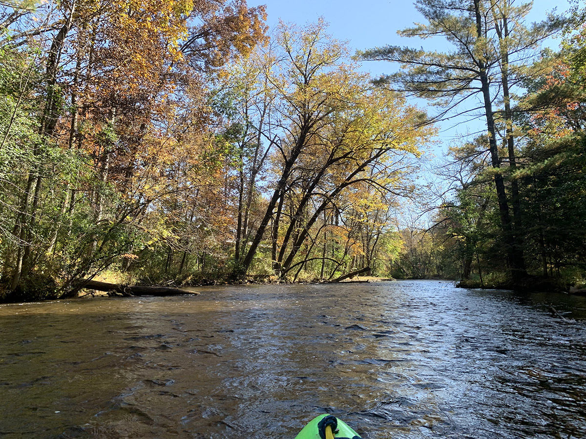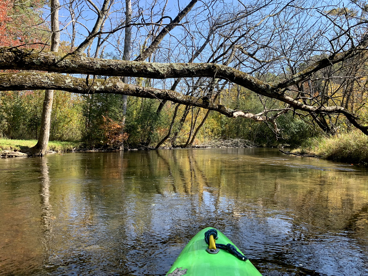 After the excitement of potentially be shot by something, there’s not much more distance to the takeout. Just more deadfall, all manageable, except there was one portage within (maybe) a hundred yards from the takeout during my visit. There was a tree that blocked the river from bank-to-bank but it appeared to have recently fallen based on the leaves still attached, so this is likely temporary. Either way, it’s shallow enough to weave your boat through the tree or bypass around on the bank (which is the path I chose).