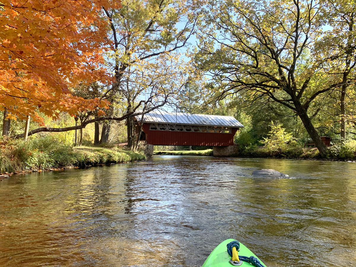 At the end of the former millpond and sitting up on Crystal Road/Highway K is the Red Mill. Soon, you’ll be paddling behind it, but not before paddling river-left past where the dam used to be (which again, shows no shred of evidence that it even existed in the first place) and then under the Highway K bridge towards Nelson Park. Nelson is a great access point and you could end your paddle here but I wouldn’t recommend it. I’ve contended before and I’ll contend again that it’s worth continuing on for another mile to Shadow Lake Road – not just because paddling behind the Red Mill and under the covered bridge is delightful, but because there’s something more fulfilling in ending this paddle on what feels like the river you put-in on versus the open environment of what was the millpond. But you do you.
