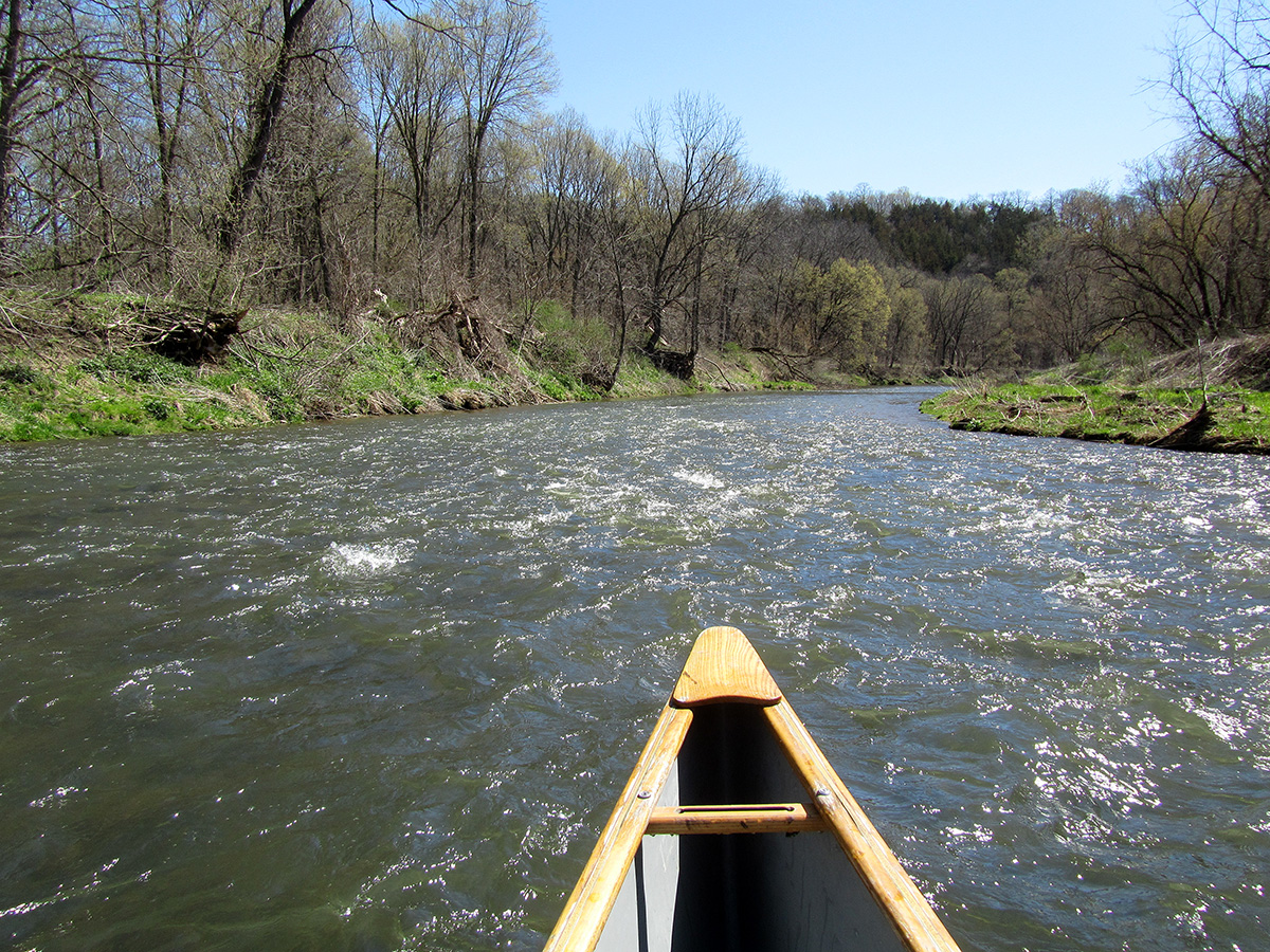 The Galena is an intimate stream, averaging about 40′ wide. It’s prone to the shallow side, but this has the effect of clear water coursing over small boulders, gravel, and sand. Like the neighboring Grant and Platte Rivers in Wisconsin, the Galena has a classic pool-riffle-pool pattern to it. You’ll invite hang-ups and headaches if you paddle it below 3′, but otherwise there should be enough water to float without bumping into too many rocks. Considering that there’s a short stretch of riffles (and/or Class I rapids, depending on the volume) around every bend, you really want be sure the river is high enough before you leave your home. That said, about a mile or so downstream from Buckhill Road – and all the way down to the Mississippi – the river gets super-deep and just as slow.
