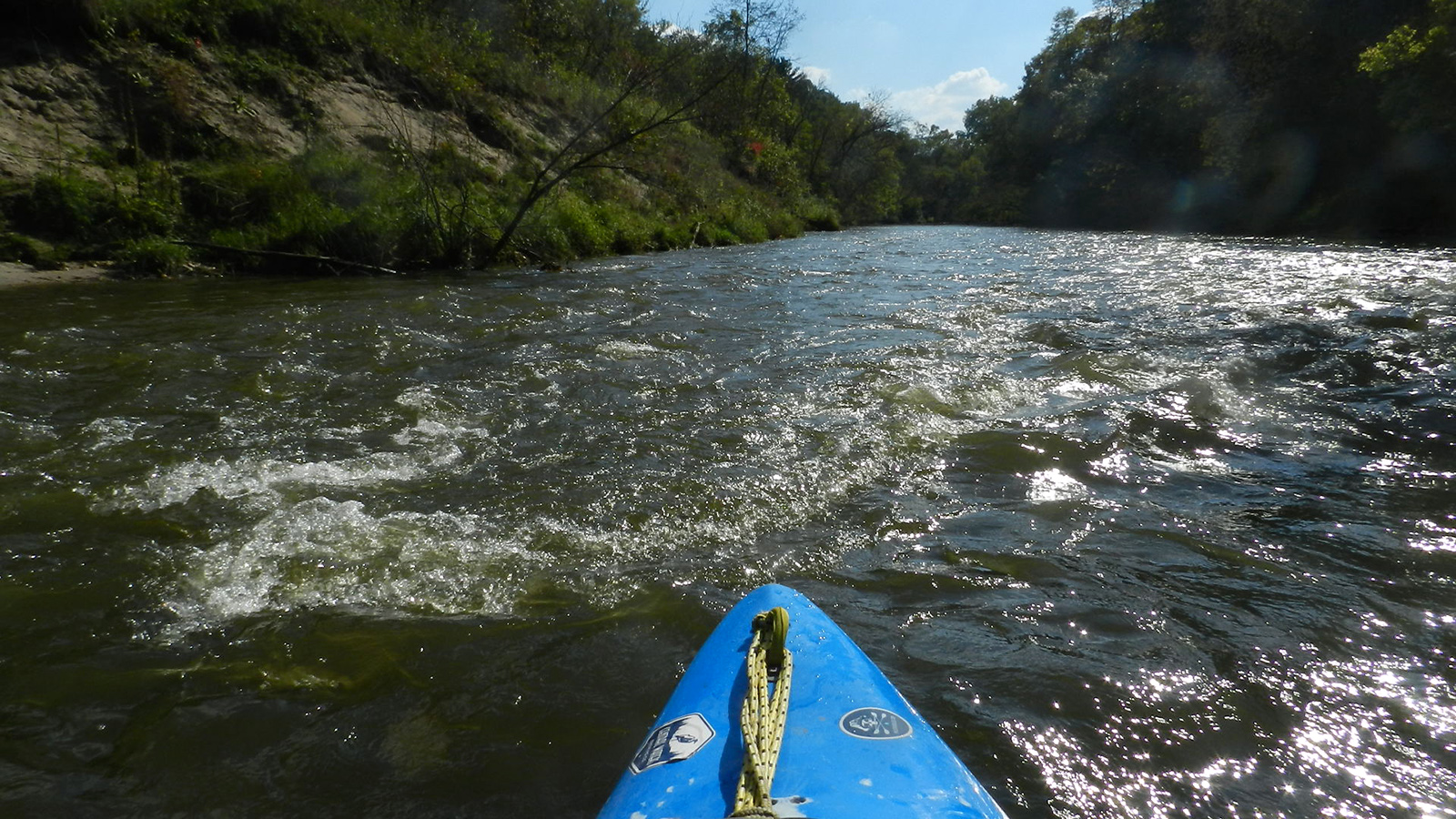 There are three sets of short riffles and light rapids, as well as one Class II ledge where a small dam was removed years ago, roughly 20 yards downstream from the County M bridge (also the halfway point at two miles in). The ledge itself is maybe 2’ high but it’s gradual, not sudden. You’ll hear it before you see it, plus you’ll see a house on the right-hand side with a “No Trespassing” sign lest your druthers to portage or scout were on the river-right. An obvious “tongue” of water like an upside-down ‘V’ shows you where to run the drop (or you can portage around it on the river-left). There’s a fantastic hole with a standing wave below the drop on the left that’s perfect for surfing or some light tricks (squirts and turns) if you’re into that. The portage path on the left provides an opportunity to run the drop as many times as your heart pleases. This drop is a delight!