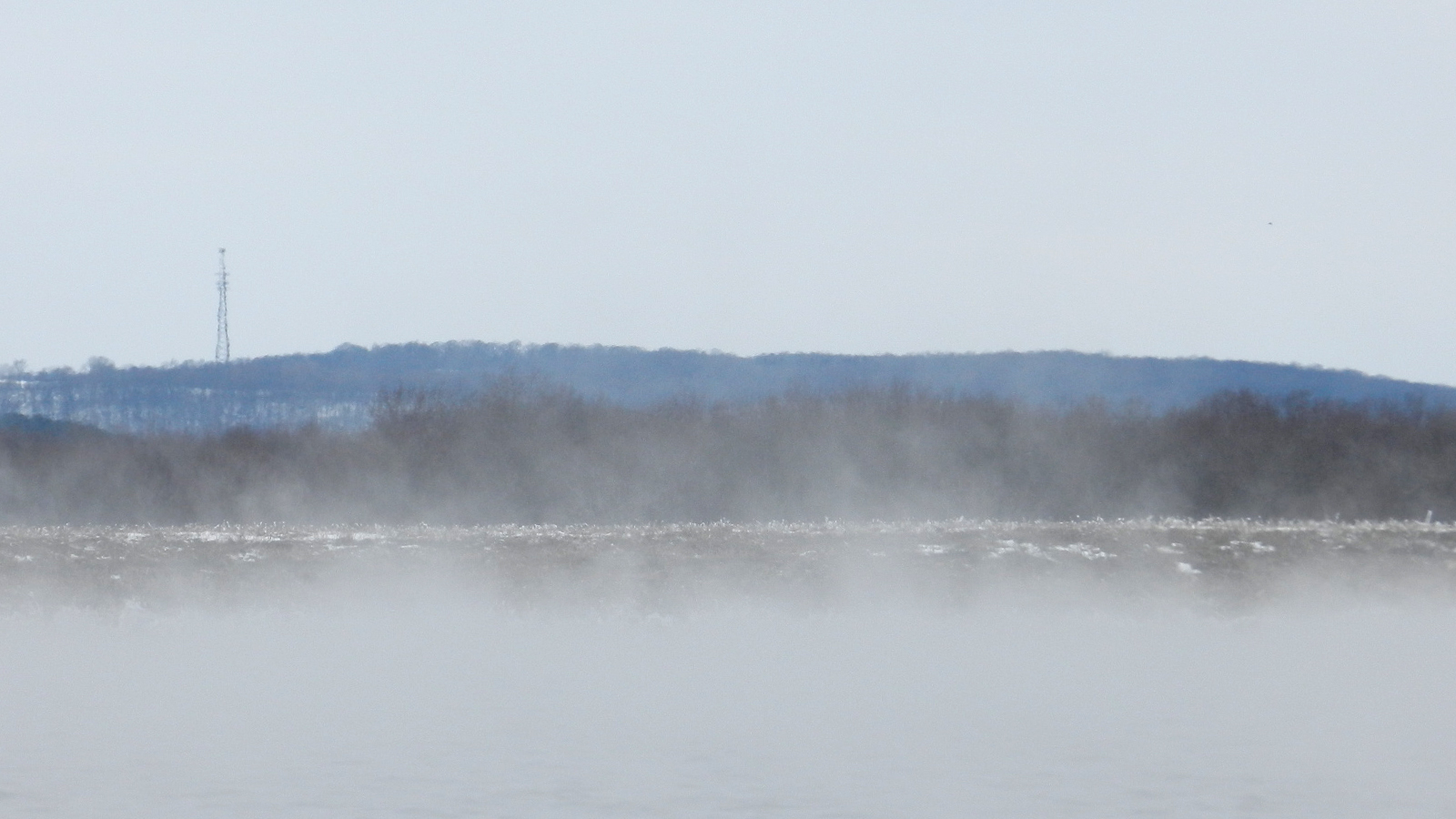 OK, enough mystical gibberish. The “lake” is almost entirely bisected into left and right pools by a thin strip of land that I guess is a dike. If I understand it correctly, the water comes from the river on the west and is drawn into the plant via the “left” pool. It’s then discharged into the right pool (east) where eventually it will circulate clockwise back into the plant. As such, the right side will be warmer and thus produce more fog.