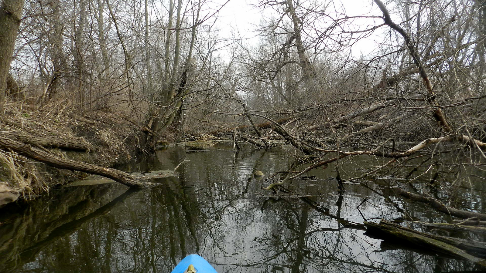 Not one to be easily stymied, I then drove up the road to the nearest public parking area into the Deansville State Wildlife Area in hopes that I could hike in to the river itself and commando launch. Not so much. After 10 minutes of stomping across a wasteland of down trees, brambles, rocks and thistles only to find a drainage ditch, I gave up trying to find passage to the Maunesha (in retrospect, I now know it’s a 0.4-mile walk to the river from the parking area, still a long schlep to paddle a shallow marsh). I wasn’t about to delve even deeper into a pathless woods with a 50-pound kayak on my shoulder, thank you very much.