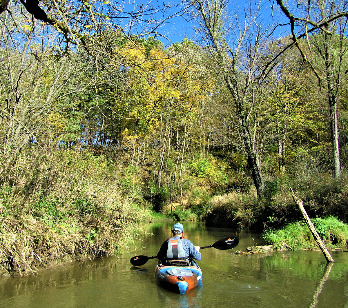 Sometimes you just play hooky. Especially when good weather days are on borrowed time come October. (Yes, I know this is a luxury, and if you think I don’t think I’m lucky as hell to be able to take a day off from work – paid time off at that – then we haven’t met.) Such was the case for this random Thursday in mid-October. We chose to return to Mill Creek because ever since we first paddled it back in 2018 (nearly to the day) we’ve wanted to A) explore the creek further upstream and B) recapitulate the surprising thrills of rapids that we encountered back then. To make a long story short, Scotty lives in Platteville, and I (Timothy) live in Madison, so Mill Creek is kinda/sorta midway between us. Ish. Ergo, we met at Mill Creek and let the chips on this gamble-paddle fall where they may.