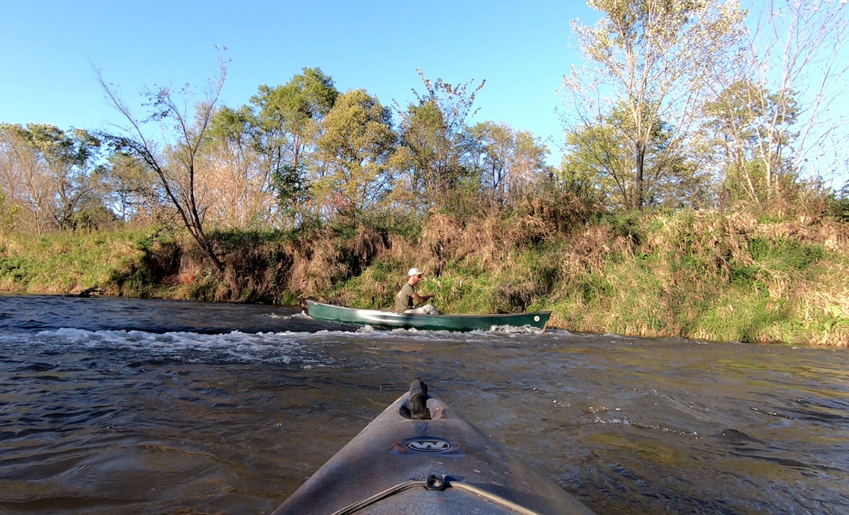 The other signature feature of this trip is the still-inexplicable whitewater about a mile upstream of the takeout, where that disproportionately humongous island (for such a small creek) splits the stream in two narrow channels, both of which descend into sudden Class I+ rapids. When we encountered this section in 2018 we were thrilled. When I took the left channels this time around it felt even wilder (and harrier). Truly, it was a delightful jolt of adrenaline.