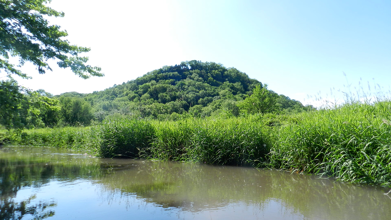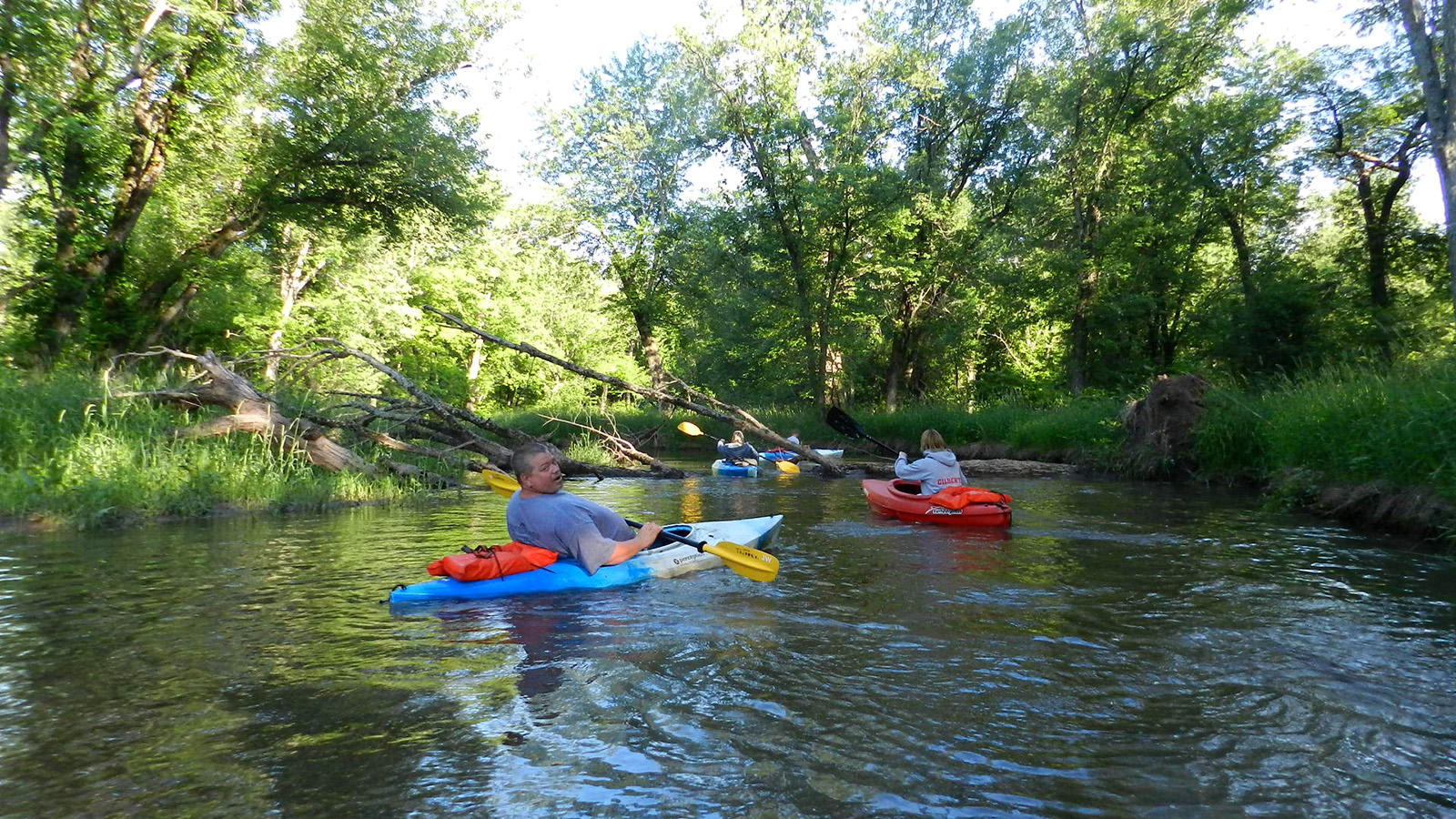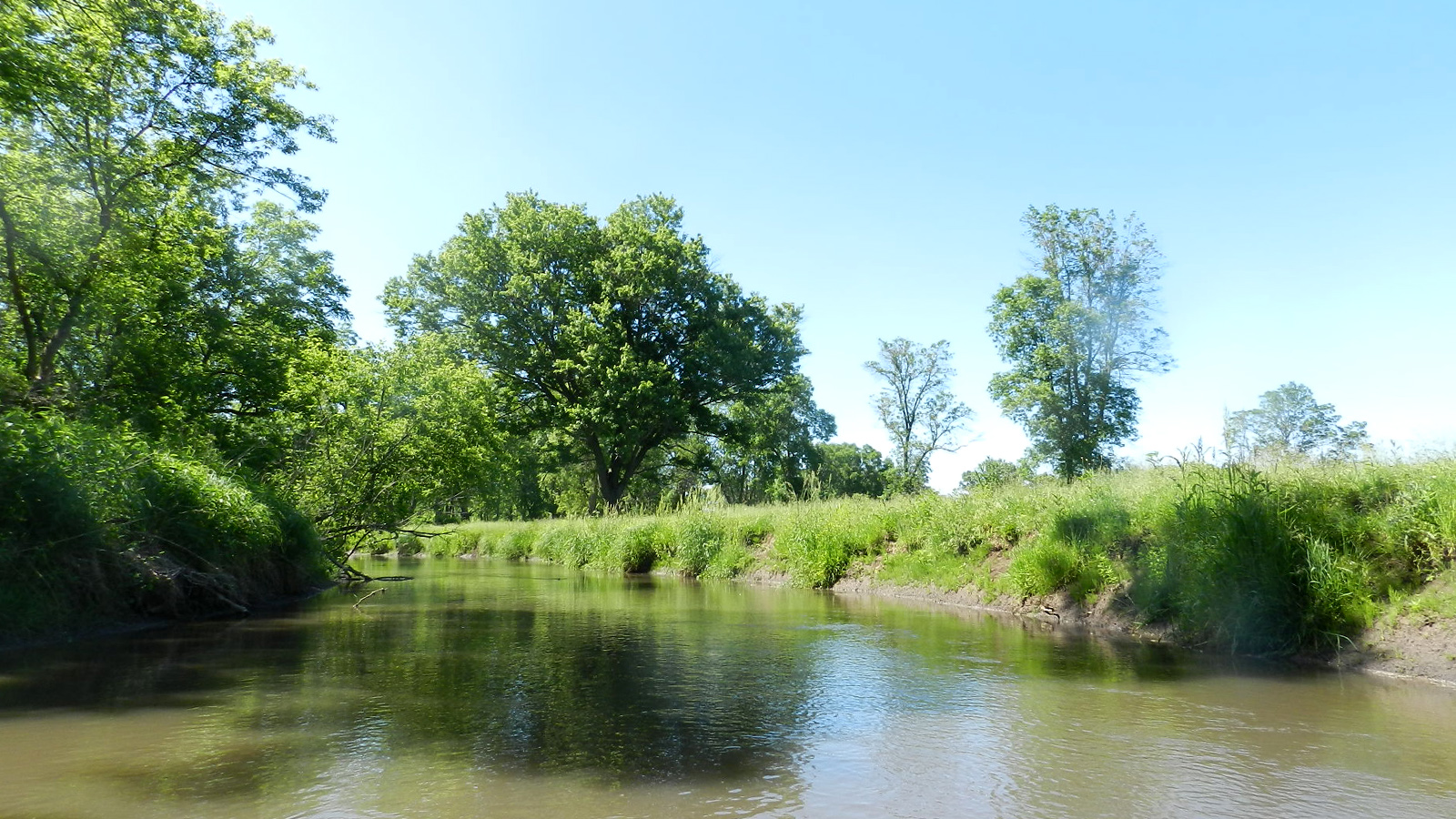 After passing under the County Road C bridge, the landscape opens up in a pretty savannah/prairie area. You nearly want to cry for joy that there are no trees around to die and fall into the creek to block you. For a little bit at least, this was the first/only time to relax. The mosquitoes were less of an issue, too, given the open exposure to wind. It was around here that I began hearing voices. Literally. You might think I was going mad after the debatable loss of blood from the mosquitoes, my frustration and fatigue and my concern that I wasn’t going to make it to my takeout ’til dark. But these were not voices in my head. I knew that at some point downstream of County C the creek would flow (I use that term loosely) past Tower Hill State Park, so I assumed there were hikers afoot. I heard murmurs from time to time. Then I began to think about Deliverance and how appropriate that would have been on this trip from hell.