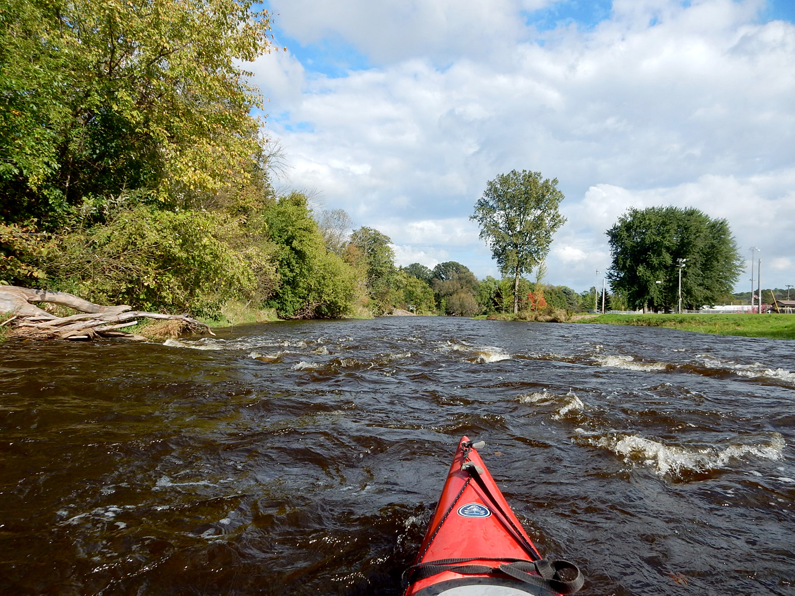 In the final two miles you’ll paddle under the Highway 33 bridge, another island that divides the river in two channels, some lovely weeping willows, a few houses, some power lines and one more marshy section. But then a modest ridge with tall conifers rises on the left bank as the river swings to the right. As it does so, riffles pick up again in earnest and will only intensify as you head into Newburg. Here too the landscape is recovering from a removed dam in 2013, discernible in the strangely flat, grassy left side that had been underwater for decades. Lively rapids engage you towards and below the Main Street (aka County Road MY) bridge. There is a dedicated access on the upstream side of the bridge, on river-right, but why would you want to forfeit that last huzzah of rapids? We continued on and just ran aground in the grass on the right bank, below the bridges, after the current subsided.