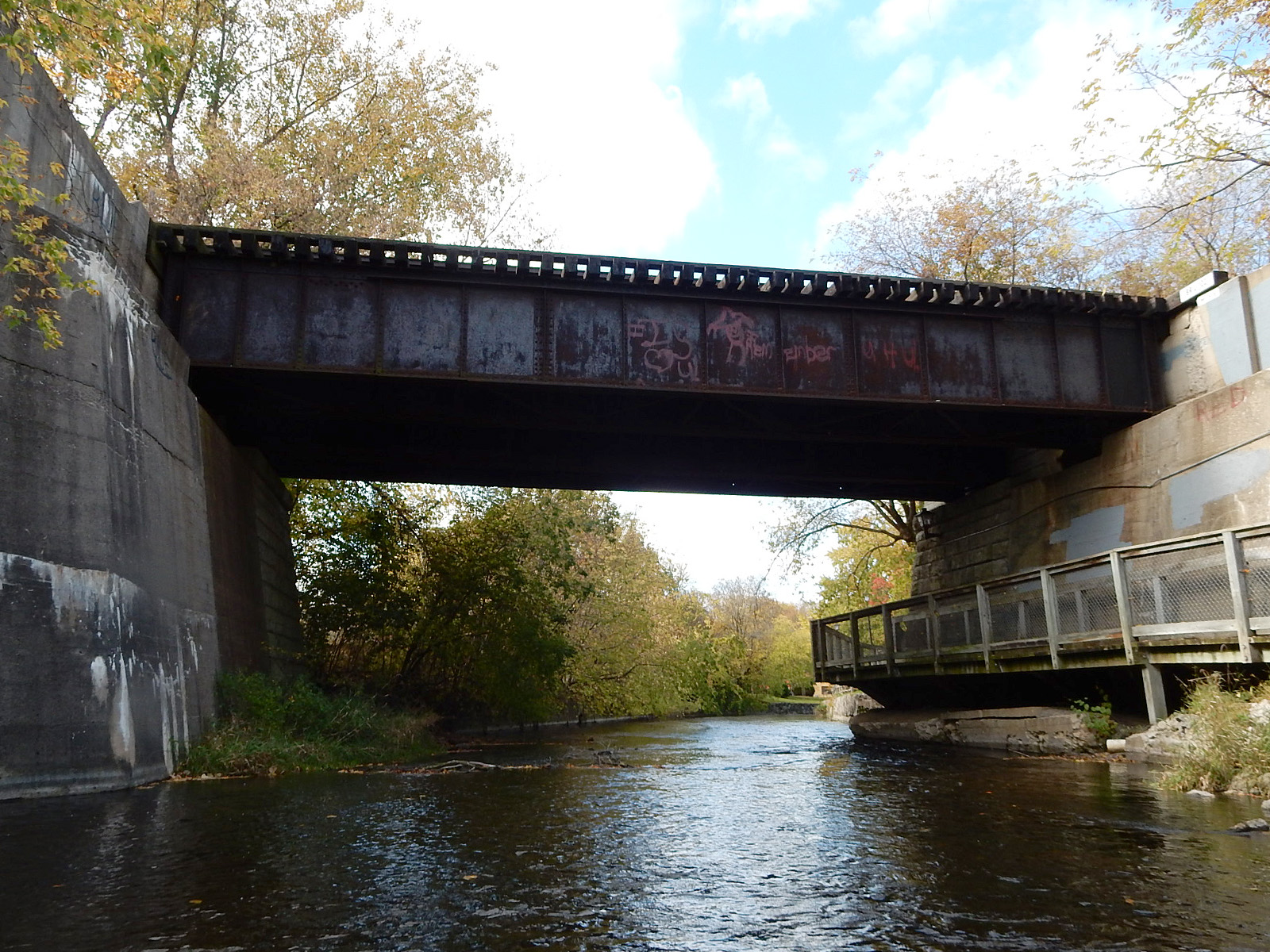 The landscape will open up as you come into a spacious public park by County Road C and Highway 67 – just after passing a massive fiberglass cow statue with a historical marker calling to mind Plymouth’s rich cheese past (and present – Sargento and Great Lakes both are in the vicinity). The current will slow down briefly as you enter a pretty marsh section. On the downstream side of the second Highway 67 bridge lies a small ledge. Then there’s a large lake-like pond section you’ll have to slog through. What’s curious about this is what causes the impoundment. On the far eastern edge of the pond are the remnants of a dam, or at least what appear to be as such. But they’re very small, like 8’ wide at best and only 3-18” above the water. That can’t very well create a fake lake, can it? Nonetheless, just to the right of the remnants is a rocky Class I-II drop. You’ll see some office building on the right bank as you come within earshot of the rapid. It’s a straightforward run – just line yourself with the “tongue” of water – but you will want to pay attention.