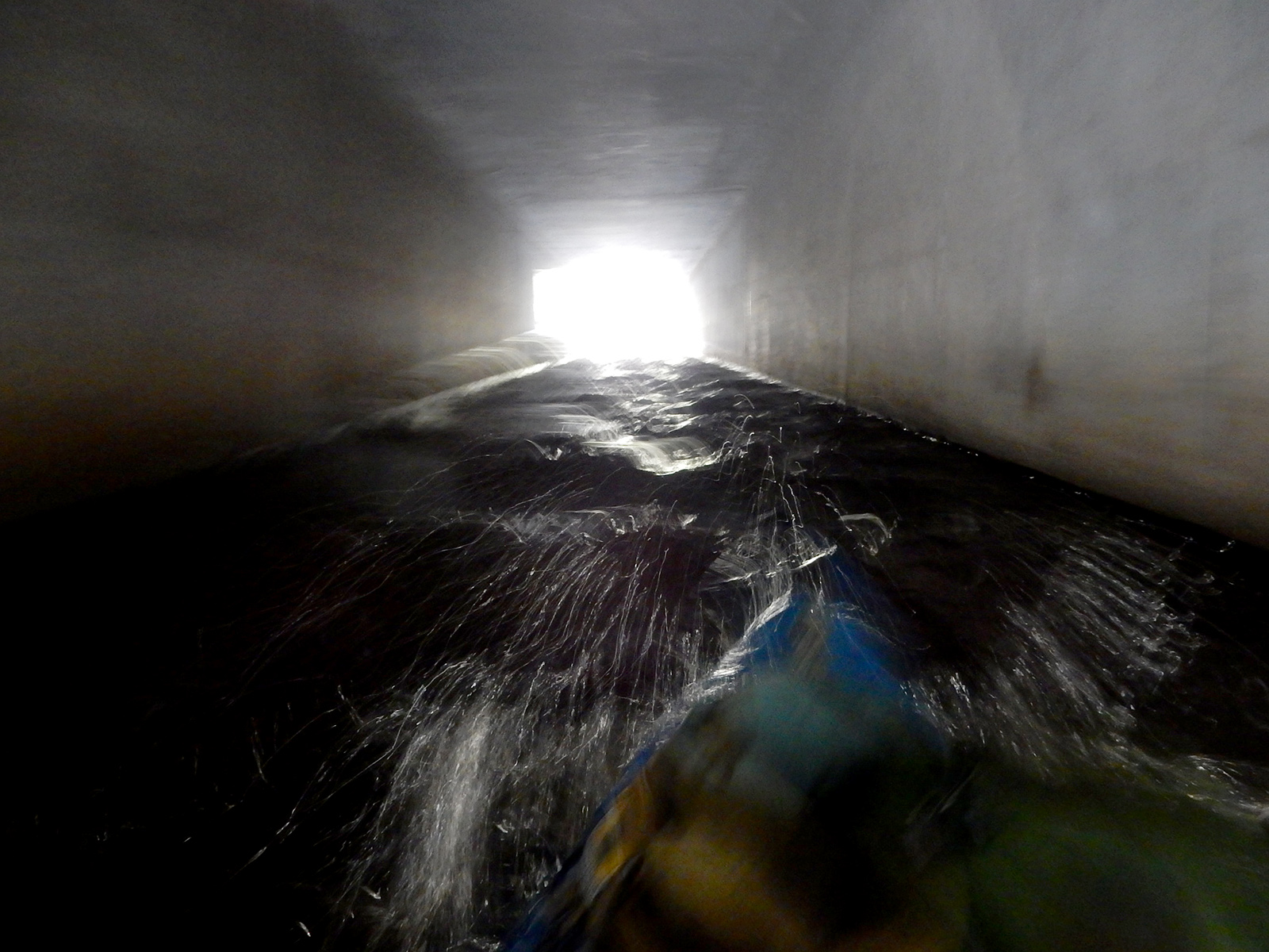 Eventually you’ll come into a stretch of tall, stately weeping willows. You’ll also have been hearing a whole lot of road noise. Both of these indicate the bridge at Highway 57. Here again, things get a little dicey. When we paddled this trip, the middle section of the bridge tunnel was totally open (the left and right tunnels were obstructed). It is to be hoped that this often is the case, because if not, this would be one hell of a horrible portage! (The banks are really steep here, and Highway 57 itself is a major road with four total lanes and very fast moving traffic. Imagine the video game Frogger – but with a kayak on your shoulder.) Anyway, there are random standing waves in the middle of the tunnel. This was both cool and kind of unnerving, since it’s all but pitch black. Since when are there rapids in tunnels? Apparently all bets are off on the Mullet.
