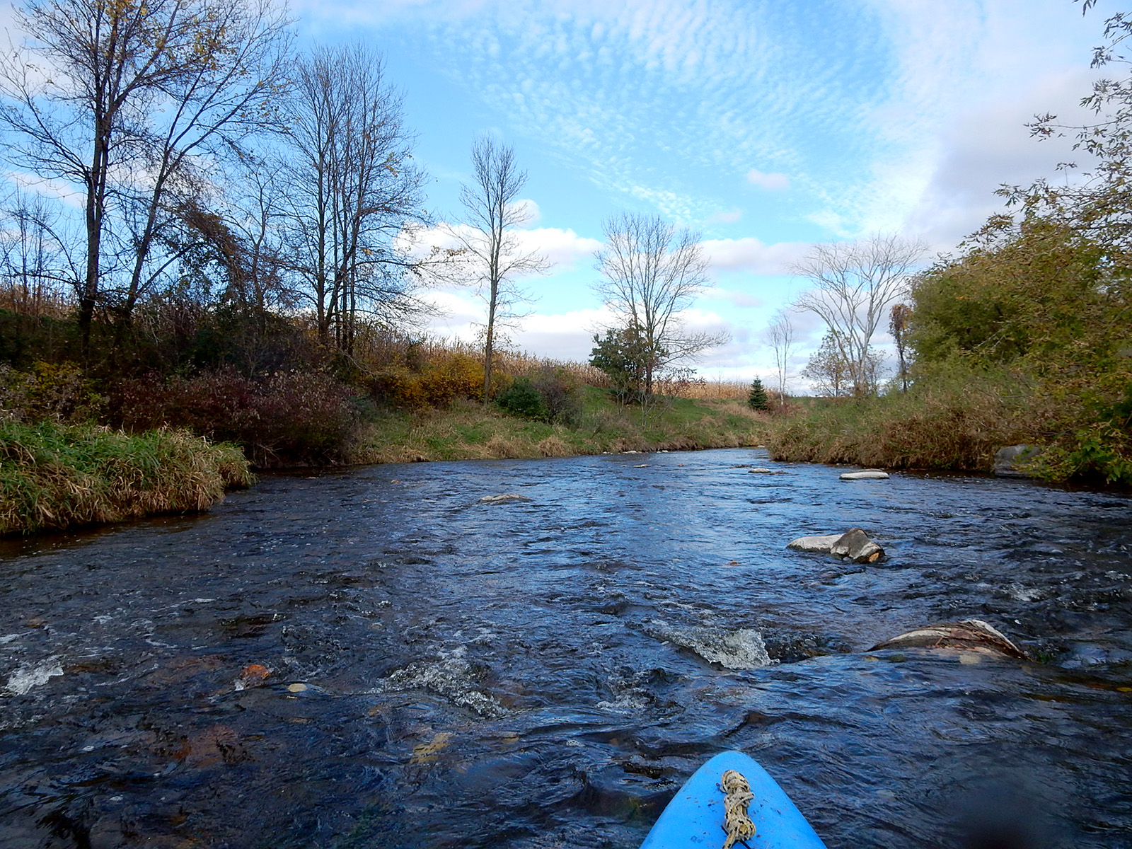 Below Highway 57 one enters a pretty and engaging boulder garden. Needless to say, this would have been more fun in less shallow water… You’re essentially at the halfway point here. After this the river runs through woods and pastures alike, each often featuring steep banks and gentle hillsides. By and by, development is sparse. It’s all very pretty and quite intimate (even for Timothy, despite being distracted by sponging out gallons of water in his leaky-ass kayak). And as before, the gradient will alternate between steep and riffly and calm and smooth.