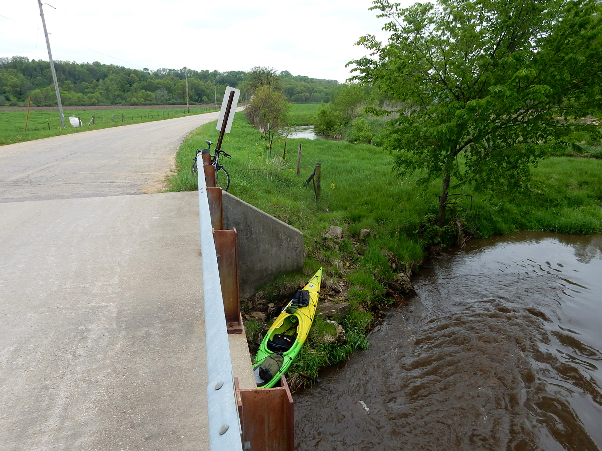 Adequate water and accesses are issues up here and remain so until Sunny Ridge Road. Sunny Ridge Road, by contrast, is very welcoming and has plenty of good water volume – that’s why we started our trip there. The access at County Road W is pretty darn lousy, frankly, as it’s steep and muddy, but it’s doable. The next bridge down is this trip’s take-out, at Banner Road. The access is less lousy, but still not all that good; but again, doable. The bridge down from there is Paulson Road, where there really is no access at all. Downstream from Paulson is Highway 191, in Hollandale, where there’s a wired cattle gate (plus no good access). Beyond that is where this so-called Dodge Branch feeds the East Branch. So, that’s how we ended up etching out this trip specifically.