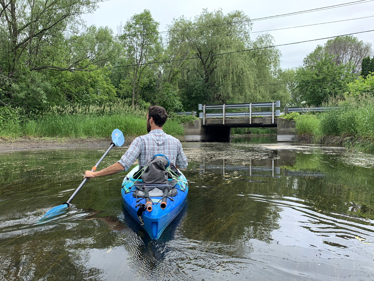 So, though we experienced none of the fun riffles or rapids, I do trust that it’s a lot of fun in higher water, but as it were, that stretch was a terrible way to spend an afternoon. To cap off that section was the encounter with the Redford Boulevard bridge which became the first bridge I ever came across that was too low to paddle through. No, we each took an opening and walked our boats over an inch of water. In the darkness, I scraped my paddle in front of me in a side-to-side motion along the concrete floor to avoid whatever may be in my path, but mainly trying to avoid any booby traps (ya know, because I may suddenly fall into a random bridge hole?), all the while staying directly in the center so as to avoid the 45-degree angled cobwebs that reached to the absolute centerpoint of the concrete ceiling. It was like a creepy runway for a Tim Burton wedding, and quite the cherry on top of this paddle.