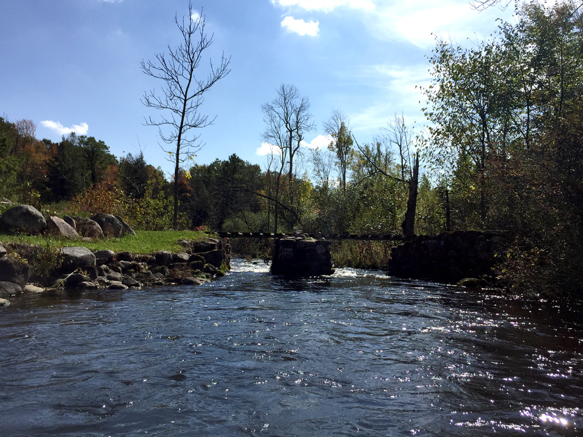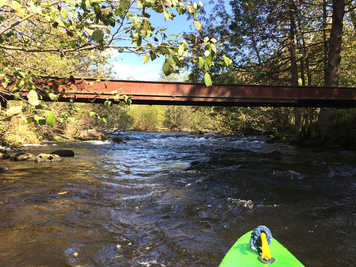 Paddling up to and under the Highway 153 bridge, there’s a ledge which is minor but still a great little drop. That’s followed by another and then a short riffly run – not even a class I. Beyond that, it gets pretty again with scattered boulders and soon, another splashy little riffly section.