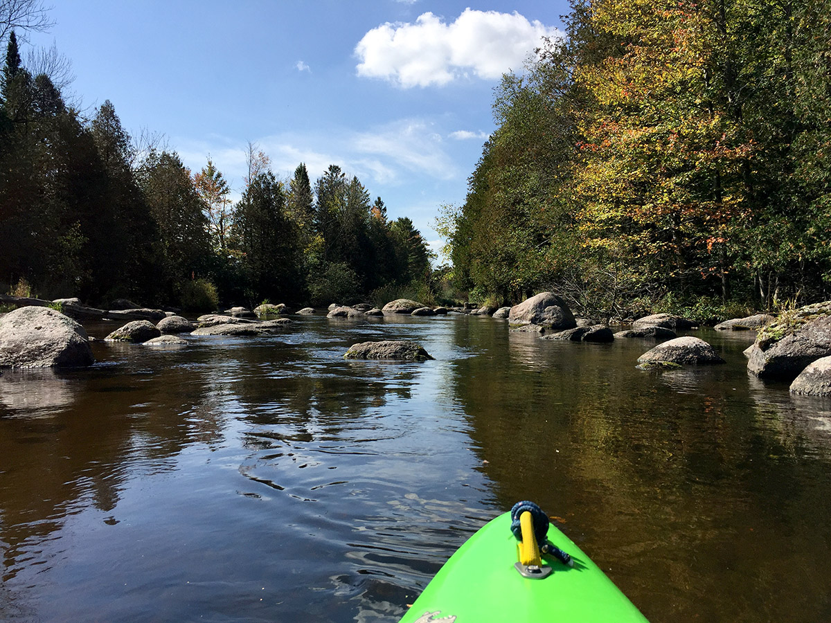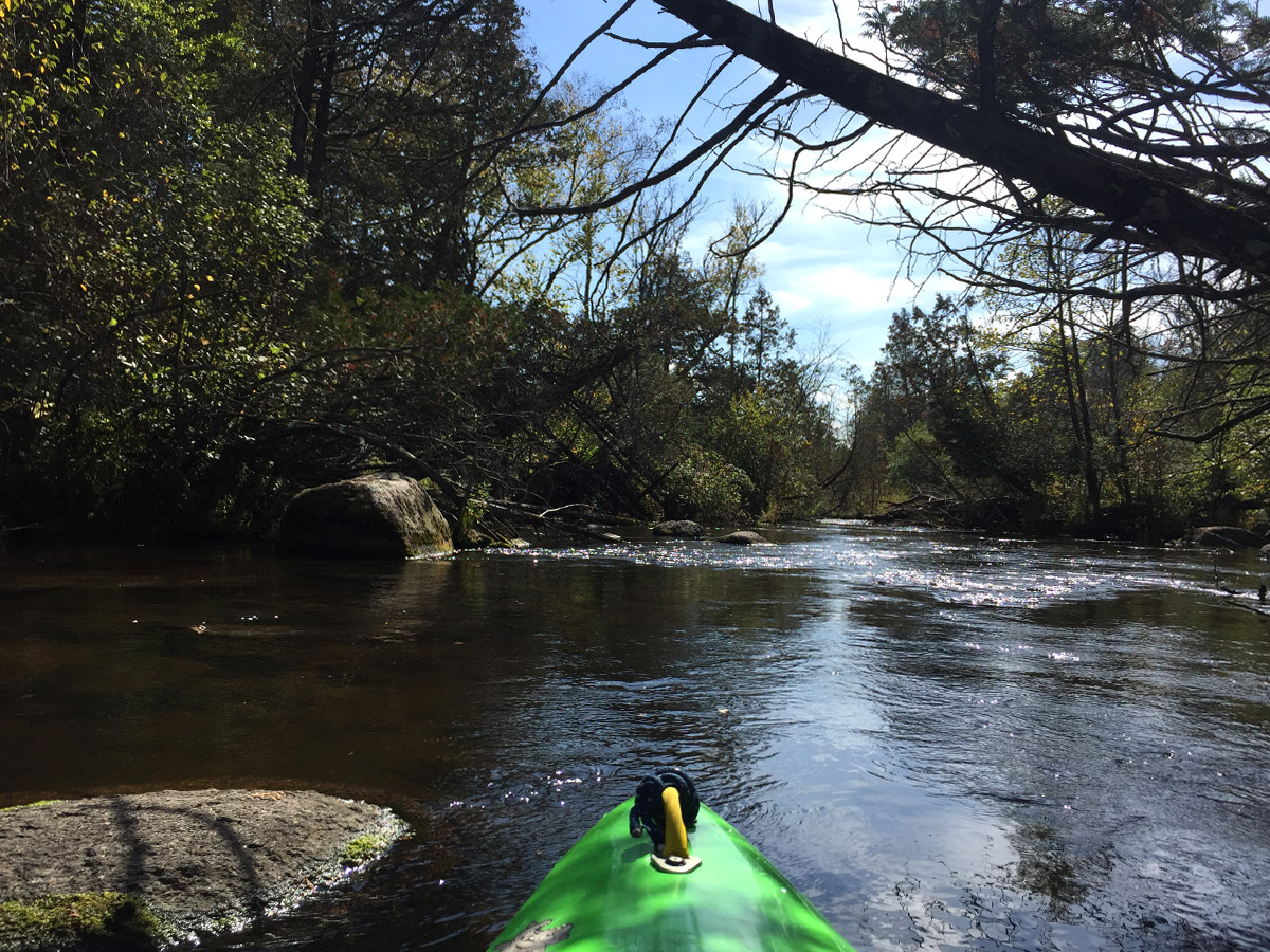 From there, it’s a game of boulder-watching, above and definitely below the surface. So as not to let one of those submerged creatures sink my vessel, I had to keep a close eye on what was ahead (although I did get hung up twice – the kind where I balanced precariously and desperately tried to shimmy off without tipping the boat). But then I got better about navigating the rocks (it takes a bit if you haven’t paddled this kind of stream in awhile – not really like riding a bike). The scattered boulders continue and the river widens as you make your way through some low-foliaged banks with some huge pines set further back.