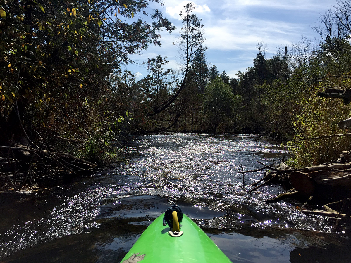 Eventually, you’ll come to another little drop created by a log and some deadfall but that leads to an awesome run around a blind dogleg-left over swift riffles through a narrow corridor which then leads to a very frisky set of Class I rapids and wave train. It all happens quickly and is really, really fun. (Yes, the blind part is a little nerve-wracking but the trail had been clear up to this point so I had to hope for the best).