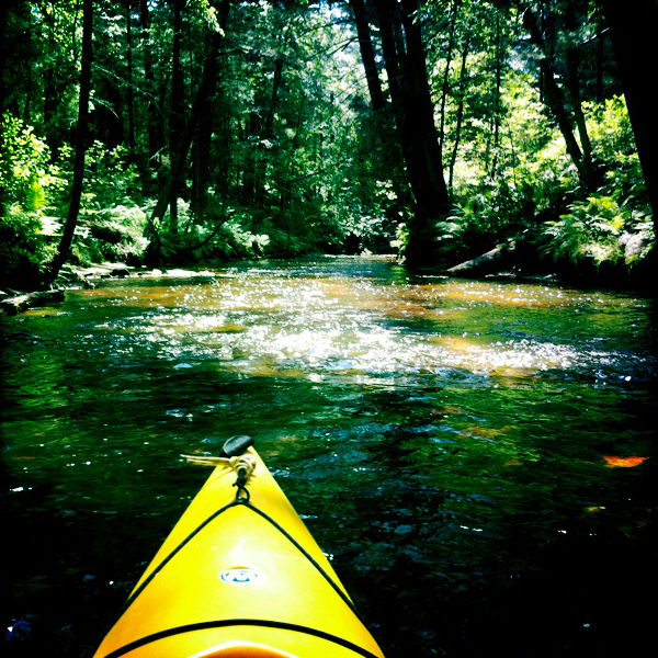 The creek is really riffly throughout and it’s one of those creeks where the horizon often appears lower, giving you the sense of paddling downhill, especially in the canyon-like areas where you’ll encounter lots of riffles. There is also a very specific class I (maybe II in higher water?) after a couple of gentle ledges. It’s in the shape of a V and kind of sneaks up on you (or it did, me). Even at this low level, my boat took on a good amount of water. My phone took the brunt of it, fogged and all, as did my map but it was a nice way to cool off. It’s actually the same drop that these canoers tipped over on. It’s really fun as long as you’re expecting it and at a higher level, you’ll have plenty of opportunity for surfing afterwards.