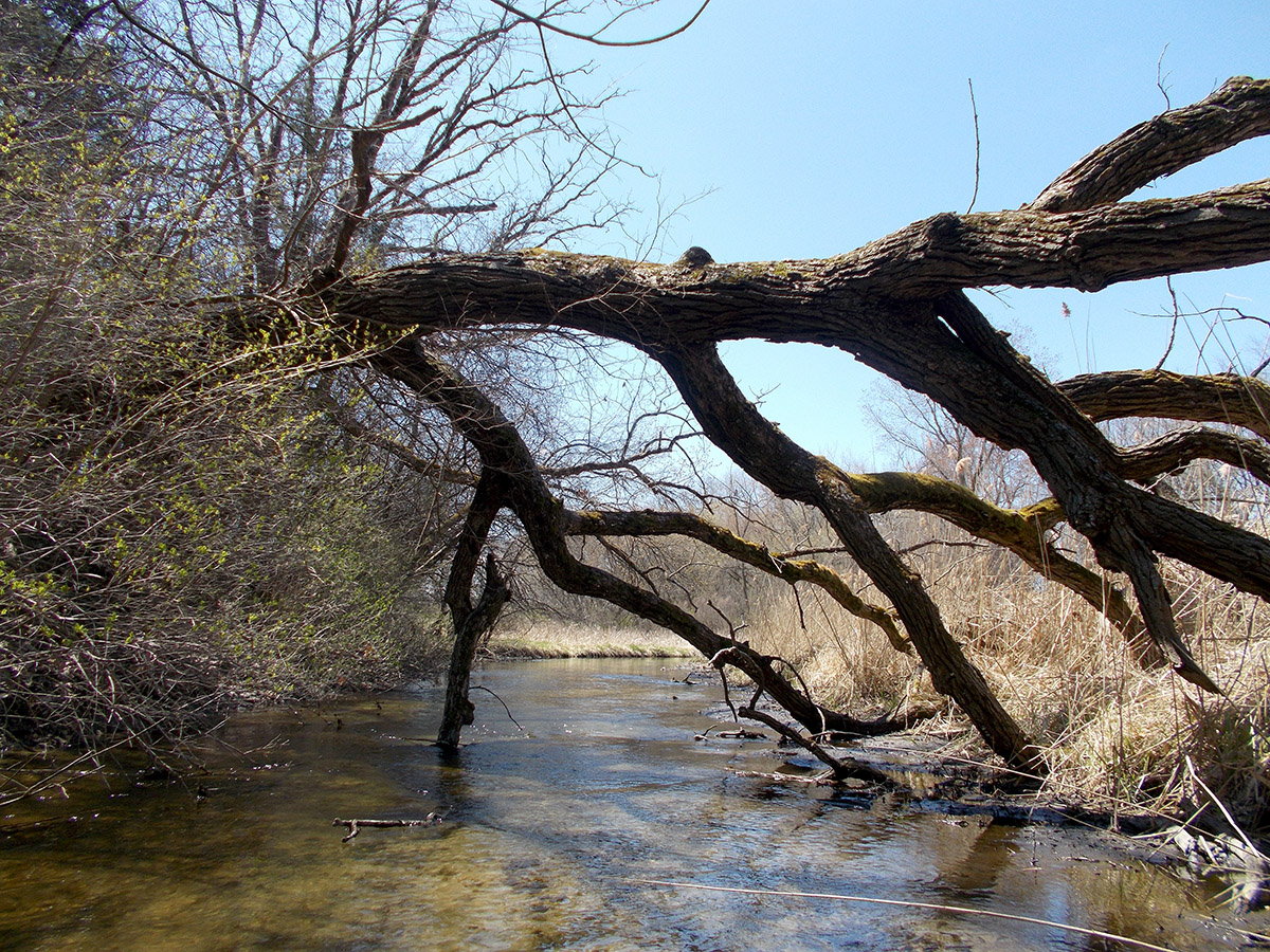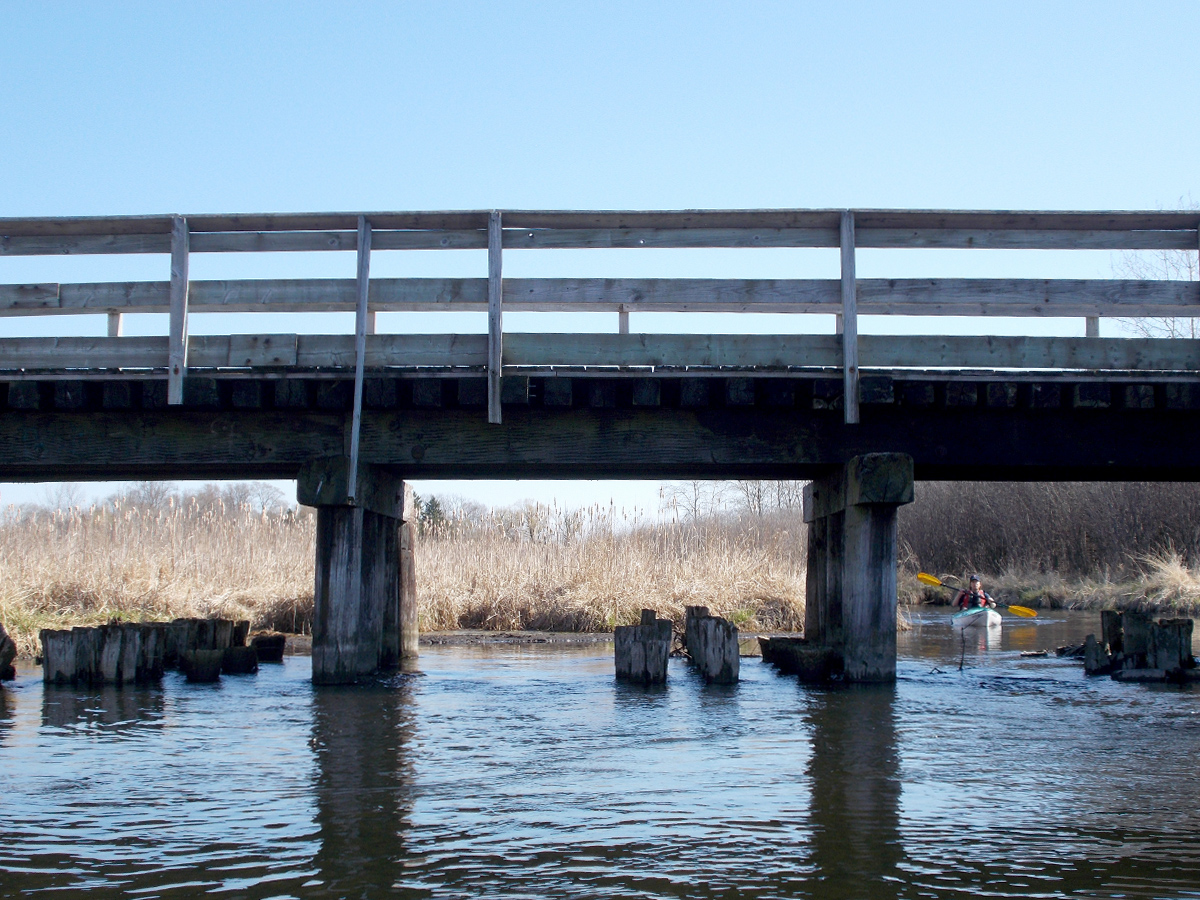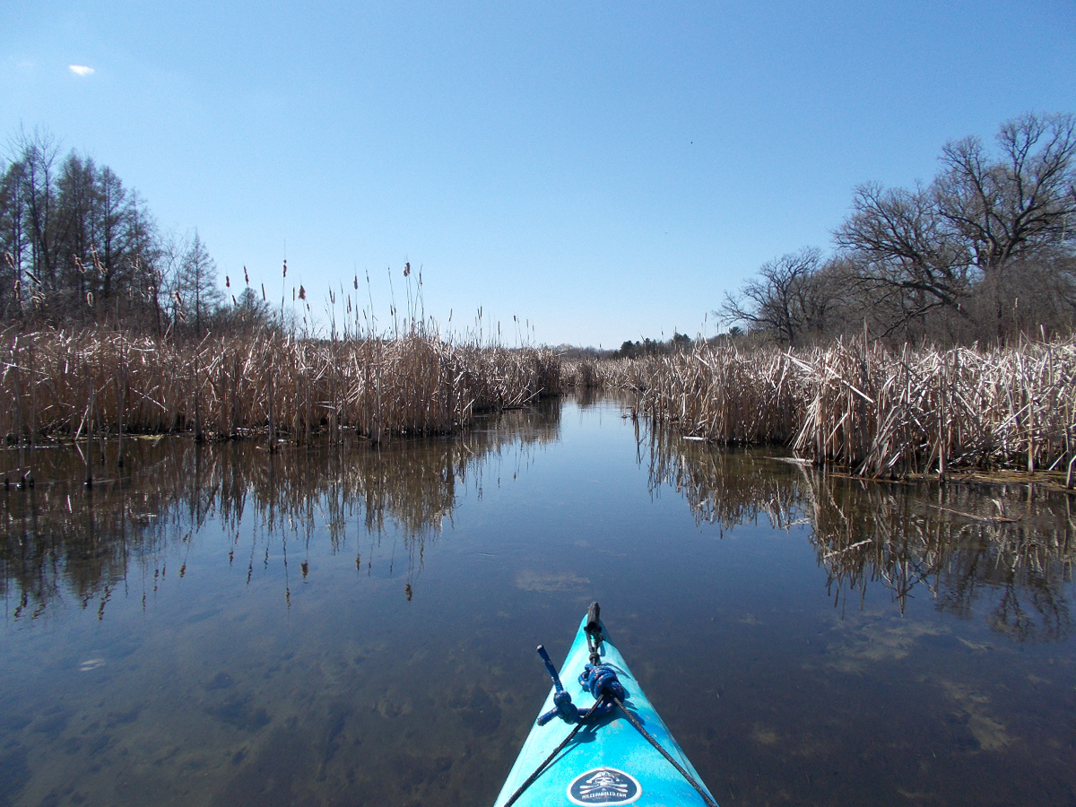 At this point you’re more than half-way done. From here to the next bridge, at County Road Z, are two miles flowing northwest – the first half of which is woodsy, gorgeous and totally undeveloped; the second, alas, surrounded by marshy cattails, subdivisions and cul-de-sacs. And mud. And carp. But things do improve after the bridge at County Z. From there to the take-out it’s only 1.3 miles, the creek here meandering north, then promptly west. Except for one isolated stretch that’s exclusively marsh, most of the time one of the banks will be lined with trees (tamaracks and hemlocks). And the clarity of the water does get better as well. Before reaching the take-out you’ll paddle under a wooden bridge that’s part of the Glacial Drumlin State Trail again. Immediately before the bridge is a fallen tree that leaves >just enough< room to work your way over on the far right. Finally, the triplet culverts at Gramling Road come into view. On our trip, both the left and right were totally open – but the middle seemed impassable. The take-out is on the downstream side of the bridge, river-left, with an easy, grassy bank that gently leads up to the road.