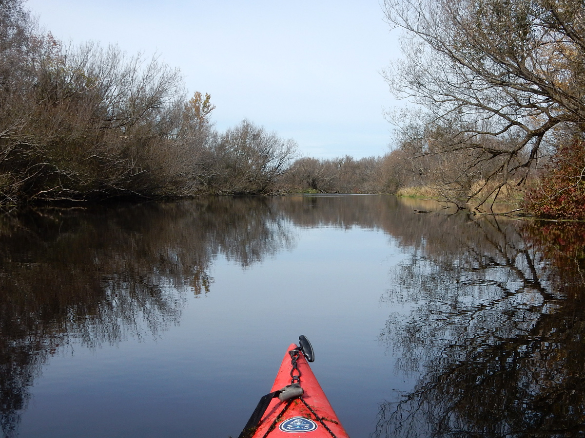 Mercifully, there’s open water again on the other side. As the river bends right, there’ll be a tight squeeze or two around some strainers, but nothing necessitating another portage. You’ll see a wide channel to the right, but it doesn’t lead to anywhere. Shortly after this, the landscape finally opens up, first with tell-tale cattails on the right. Suddenly – and it really does feel like that – you’ll see a huge open body of water on the left. When we paddled this, I wondered aloud “What the… Where the hell is that coming from?” It definitely looks like it would be the main channel, but it just isn’t. It’s simply a backwater that looks all the more deceptive on account of a long peninsula-like tree line. The tree line divides the river just about perfectly into equal halves. So, what you see on the left looks like a separate channel, but it’s a trick of the eye. Confused? We were! But if you look at the map, it’ll make sense.