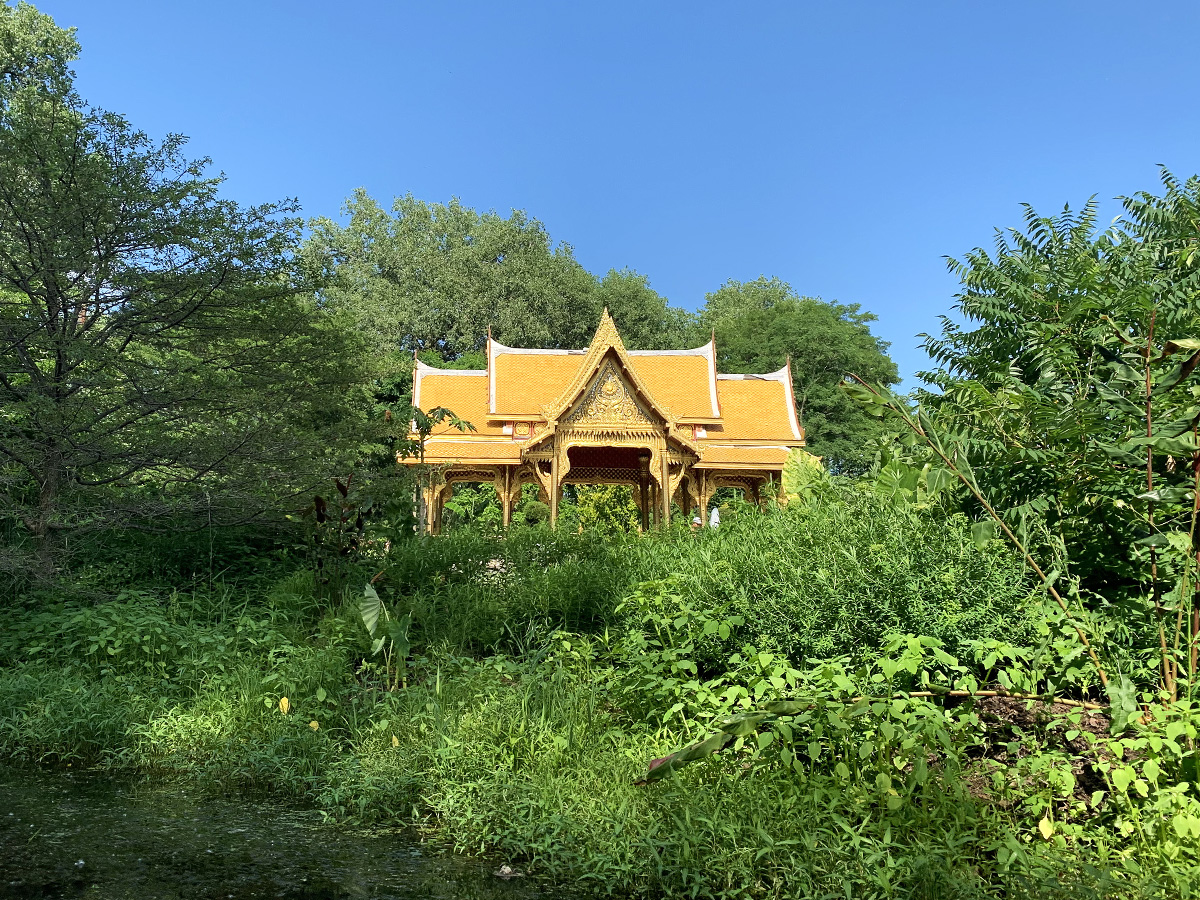 It’s not too long before the creek opens up once again at the meeting with the east branch. (Much to our surprise, it was there we were met with many paddlers coming downstream from the east branch.) In this area we encountered large beds of weeds but it was mid-summer and the water is generally slow-moving so I’m not sure it slowed us down more than normal. Soon comes a railroad trestle, followed by the lovely Olbrich Thai Pavilion which appears on creek-left right before the Olbrich footbridge and the grounds on creek-right.