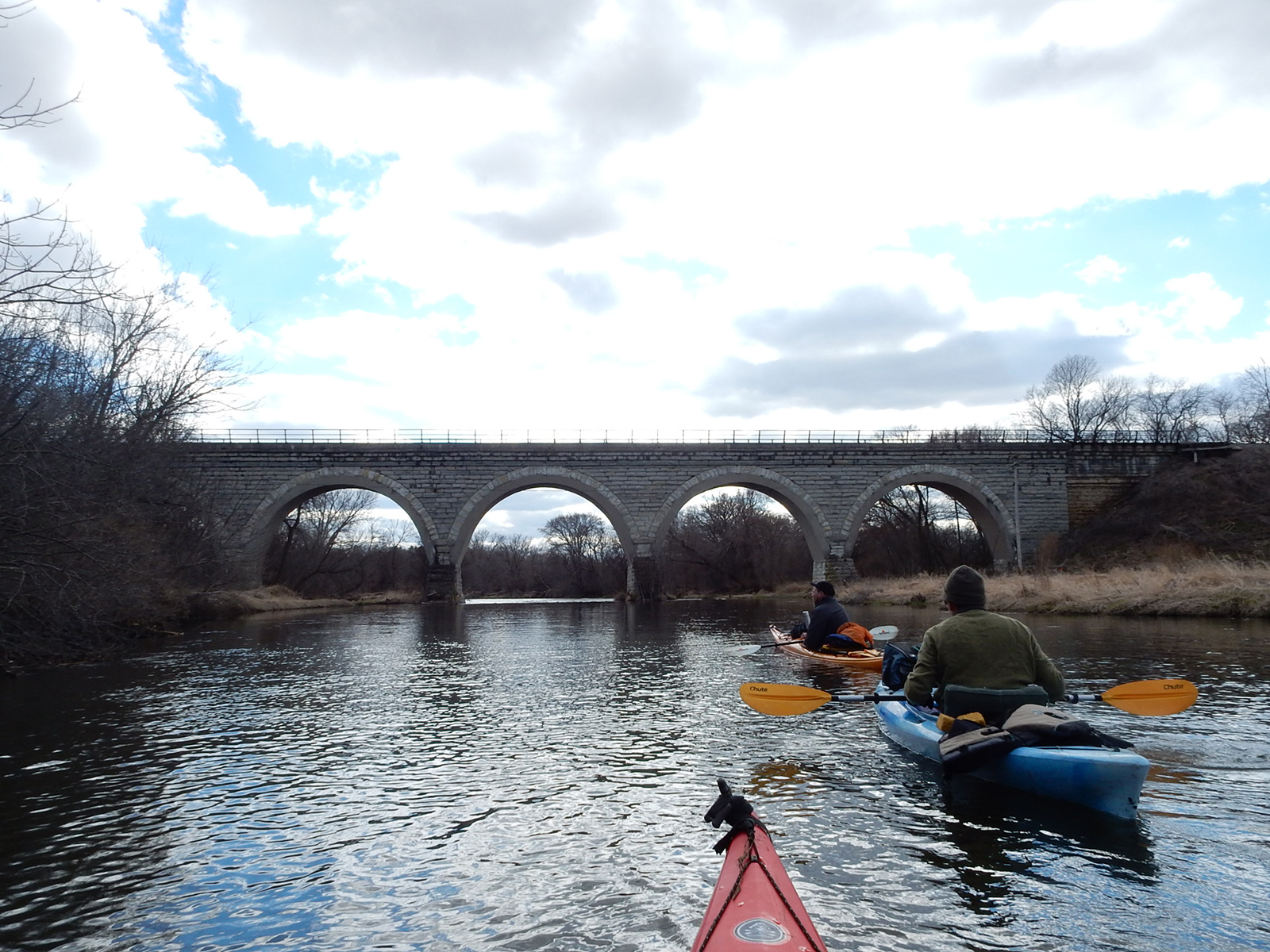 The first third of this trip comprised more great blue heron sightings than I think I’ve ever seen in such a short distance. Just after the first bridge on river-right, one is treated to a long exposed rock wall, about fifty-feet-high that runs parallel to (but set back from) the creek for about half-mile. It’s part of the same geological formations found in the delightful Carver-Roehl County Park, where the tiny Spring Brook runs through before emptying out into Turtle Creek. One of the highlights of this trip is the beautiful Tiffany bridge, a five-arched limestone railroad bridge, under which a small Class I rapid/riffle is found.