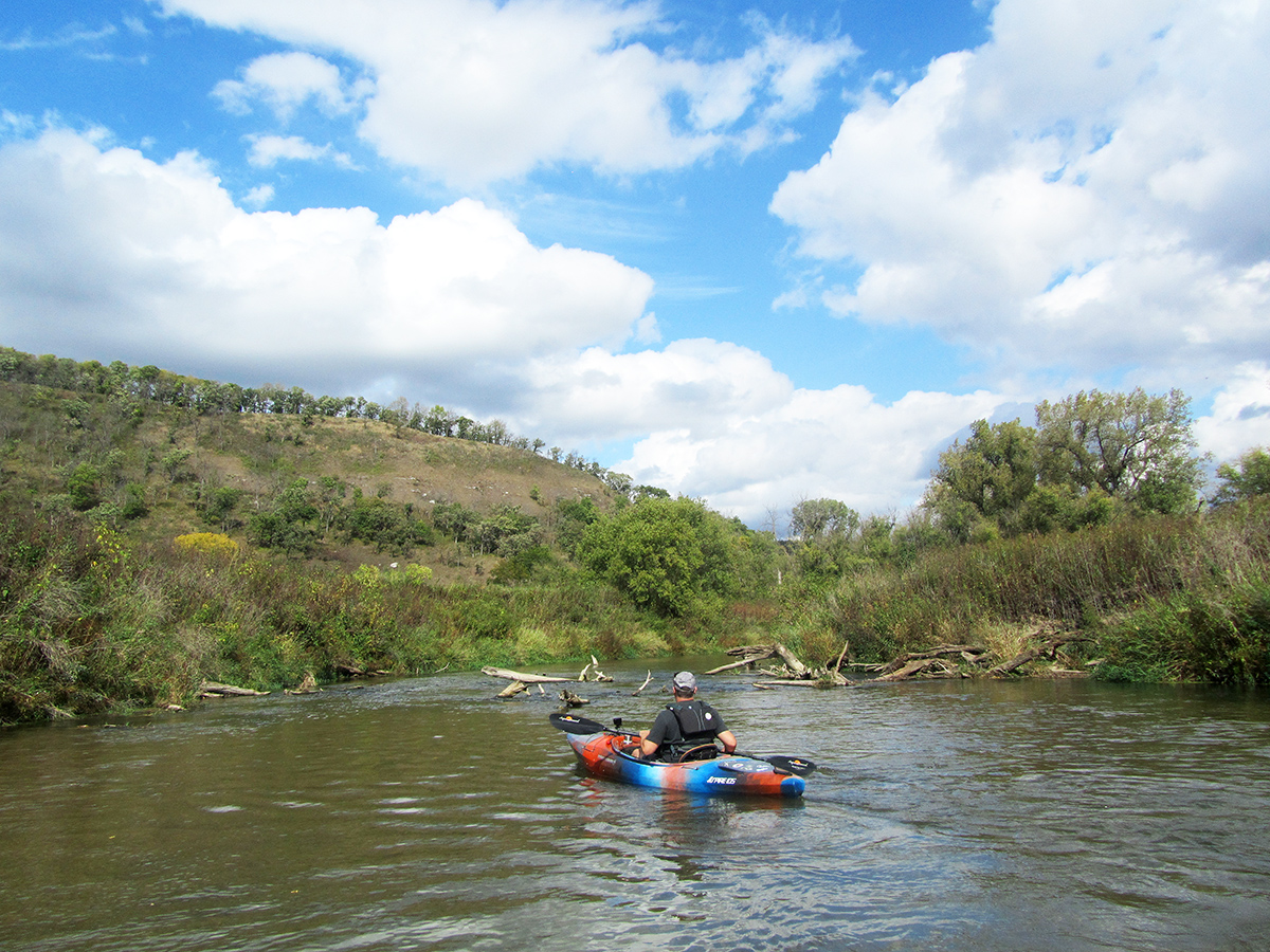 With all the respect in the world due to Lynne and Bob Diebel, the dynamic duo behind the indispensable Paddling Southern Minnesota guidebook, their entry on the Whitewater River is nearly as short as the river itself. Plus, there are some updates since the presumed time of their paddle. To be sure, they lay out a clear 10.5-mile trip that begins at the Highway 26 bridge in Elba and goes down to “a sloping sandy spot” at the edge of Highway 74. Fair enough, but what about the last half-dozen miles to the Mississippi? At the time of the Diebels’ writing, they warned that obstructions become so numerous as to render that segment unenjoyable. That said, here is a video from an undaunted paddler going all the way down to the Big Muddy in August 2022, and it doesn’t look all that bad. Moreover, this segment of the river is surrounded by the Whitewater Wildlife Management Area, a sprawling public lands nearly 28,000 acres large. I can vouch that it’s a weird and spooky place, with dikes slit into the landscape and seemingly random pools like liquid craters. In the foreground, everything is super flat. But then it’s enclosed within steep hills, some rising 500′ high.