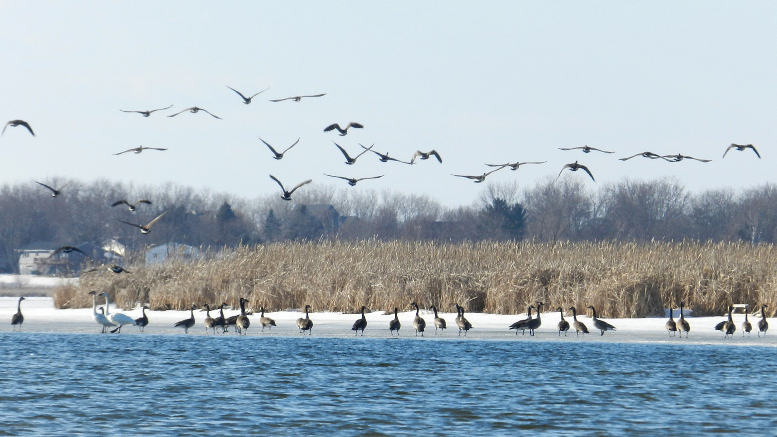 Tundra swans, geese, ducks, mergansers and muskrats.